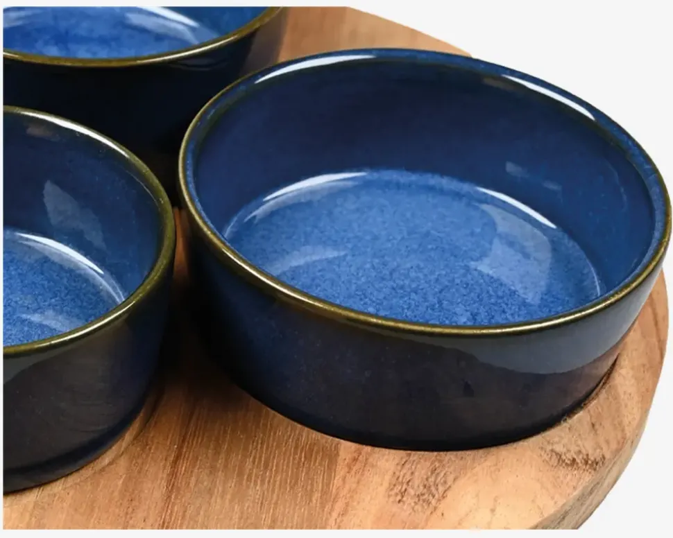 Skåle i blå med tilhørende bakke. Skålen har en højde på 4 cm og selve bakken har en diameter på 20 cm. Praktisk og dekorativ til servering af snacks, dips eller små anretninger. Bakken beskytter bordet og fuldender det stilrene udtryk.