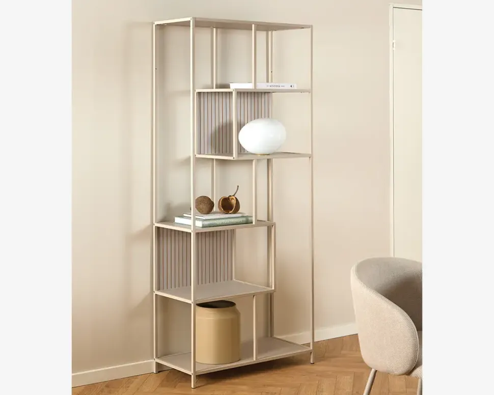 Fritstående reol i grå pulverlakeret metal med hylder i grå melamin. Hylderne er placeret asymmetrisk, som i sig selv er meget skulpturelt. Det giver reolen en meget dekorativt udseende og giver et flot og anderledes look. Bagbeklædningen er vendbar, så man kan have en glat overflade eller en rillet overflade, som giver et mere eksklusivt udtryk.Reolen kan selvfølgelig også stilles langs en væg og sammensættes med de andre reoler i denne serie.• Fritstående reol.• Grå pulverlakeret metalstel• Hylder i grå melamin• Dekorativt udseende• Leveres usamlet, men samles nemt• Mål i cm. B.78 x D.35 x H.185