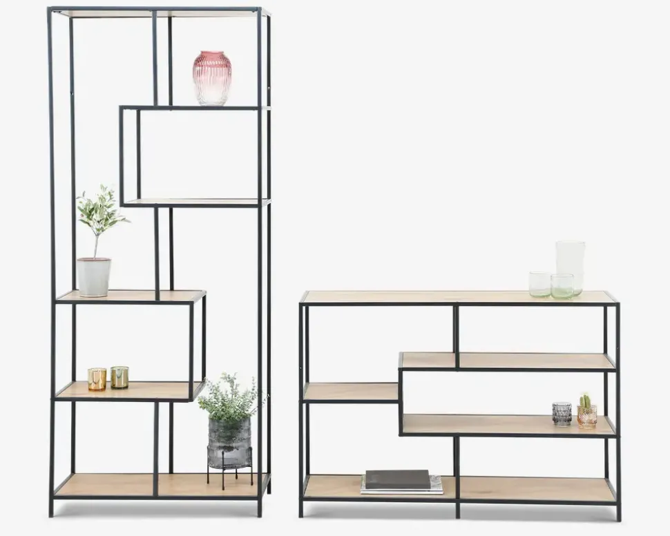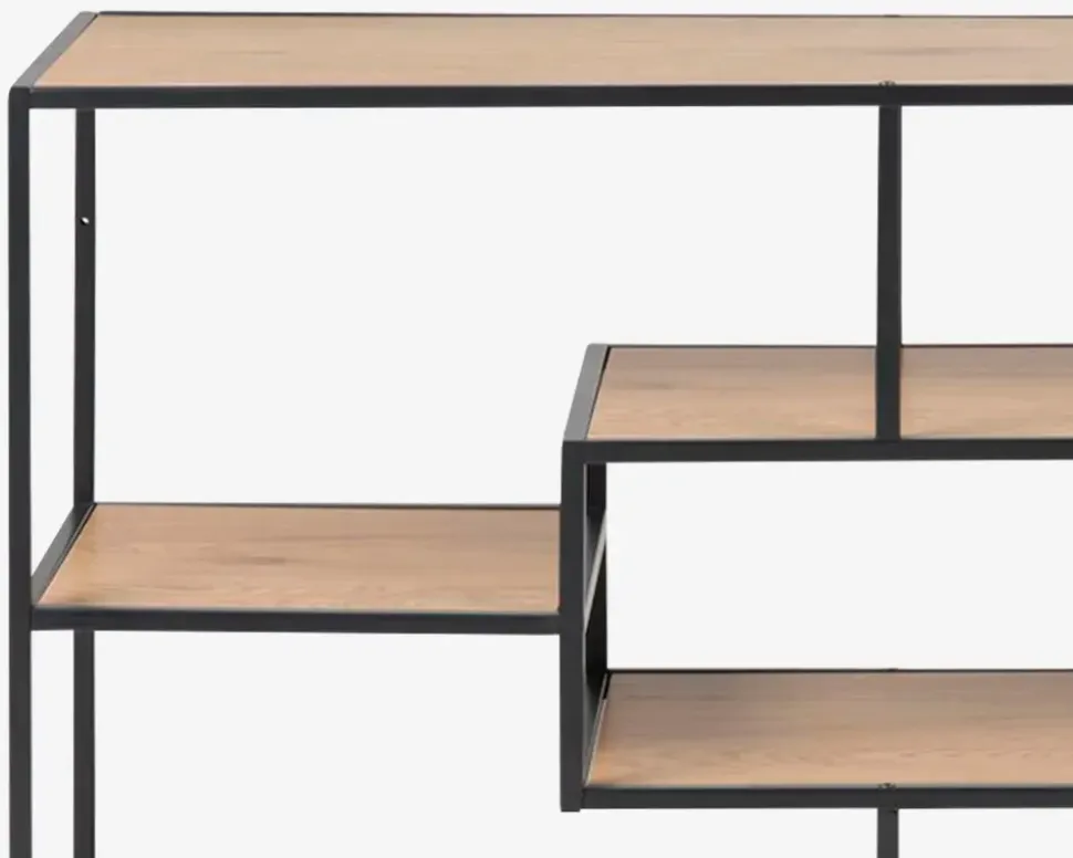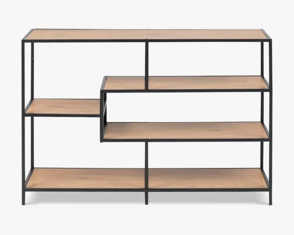 Fritstående reol i sort lakeret metal med hylder i vild eg farvet kunstfiner. Hylderne er placeret asymmetrisk, som i sig selv er meget skulpturelt. Det giver reolen en meget dekorativt udseende og giver et flot og anderledes look. Reolen kan selvfølgelig også stilles langs en væg.I denne serie kan der fås mange forskellige møbler, som gør det muligt at møblere de fleste rum i hjemmet med lige netop denne serie. Serien består af meget ”lette” møbler som kan give et enkelt og flot udtryk overalt i hjemmet. Flere typer sofaborde, tv-borde, reoler, serveringsvogne, skriveborde. Med denne serie er det nemt at indrette sig hyggeligt og praktisk på samme tid.• Fritstående reol.• Sortlakeret metalstel• Hylder i lys vild eg farvet kunstfiner• Dekorativt udseende• Leveres usamlet, men samles nemt• Mål i cm. B.114 x D.35 x H.78