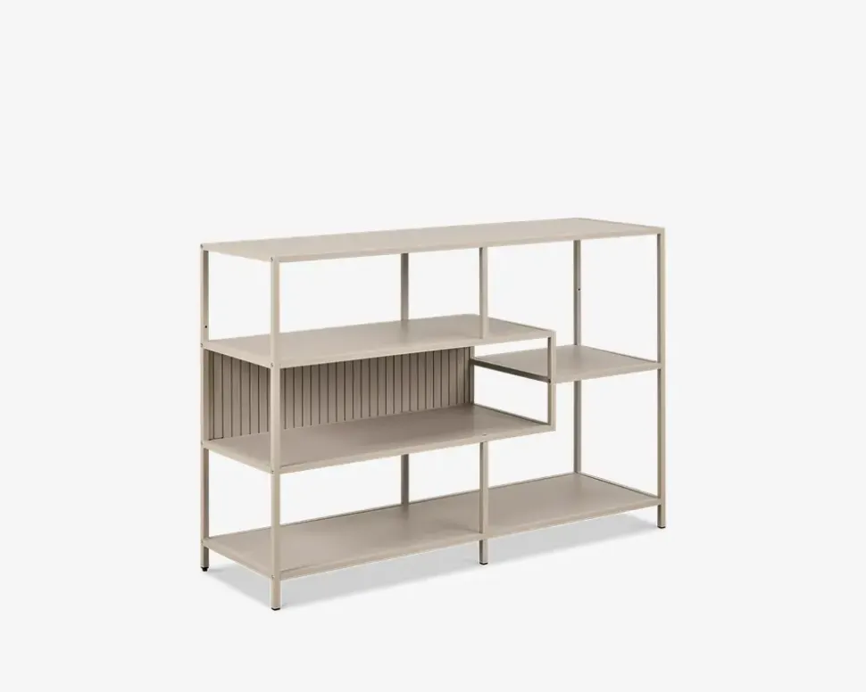 Fritstående reol i grå pulverlakeret metal med hylder i grå melamin. Hylderne er placeret asymmetrisk, som i sig selv er meget skulpturelt. Det giver reolen en meget dekorativt udseende og giver et flot og anderledes look. Bagbeklædningen er vendbar, så man kan have en glat overflade eller en rillet overflade, som giver et mere eksklusivt udtryk.Reolen kan selvfølgelig også stilles langs en væg og sammensættes med de andre reoler i denne serie.• Fritstående reol.• Grå pulverlakeret metalstel• Hylder i grå melamin• Dekorativt udseende• Leveres usamlet, men samles nemt• Mål i cm. B.114 x D.35 x H.78