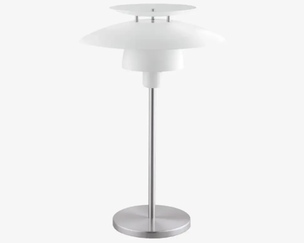 Klassisk og stilren lampe, som passer ind i et hvert hjem. Lampens skærme reflektere lyset flot, så du får et optimalt og behageligt lys uanset hvor du vælger at bruge den.Kombinér evt. både en pendel, en bordlampe samt en gulvlampe og skab en rød tråd i indretningen.• Mål i cm.: H.50 x Ø.32• Farve: Hvid/Børstet Stål• Materiale: Metal• Fatningstype: E27, maks. 60• Ekskl. lyskilde• IP-kode: IP20• Ledningslængde: 140 cm
