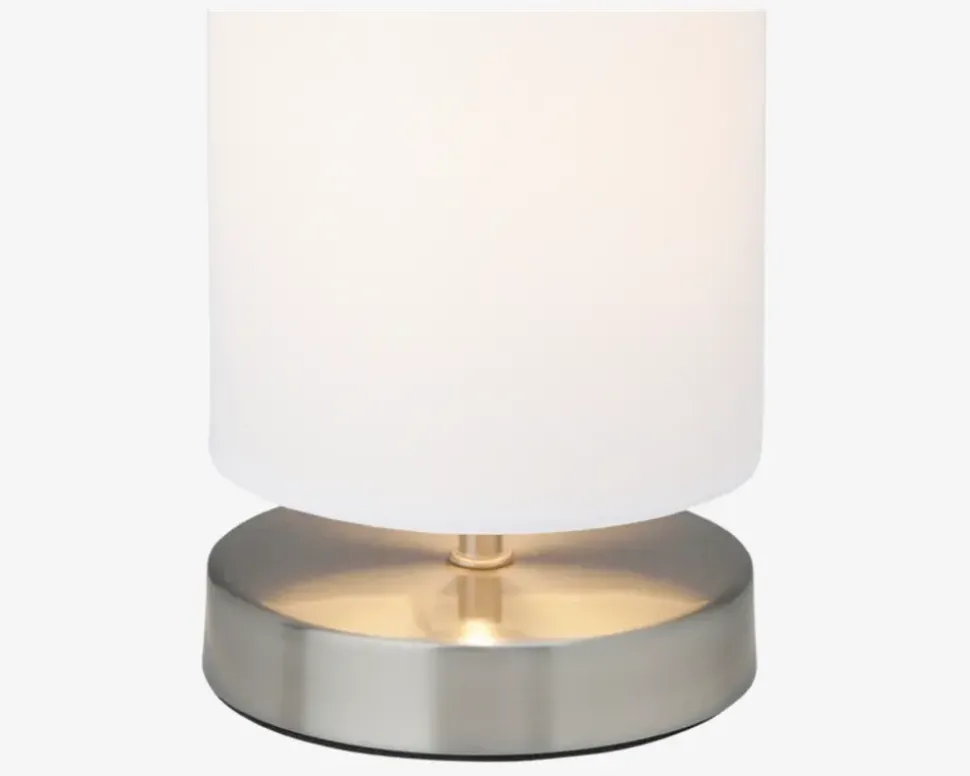 Fin og dekorativ lille Clarie bordlampe. Lampen giver et indirekte lys, og er derfor specielt velegnet på sengebordet, hvis ikke du læser i sengen, eller på reolen hvor du trænger til lidt lys, i den mørke sæson.• Mål i cm: H.25 x Ø.12 • Farve: Hvid/børstede stål• Materiale: Metal/Stof• Fatningstype: E14, maks. 40W• Ekskl. Lyskilde• IP20• Ledningslængde: 150 cm