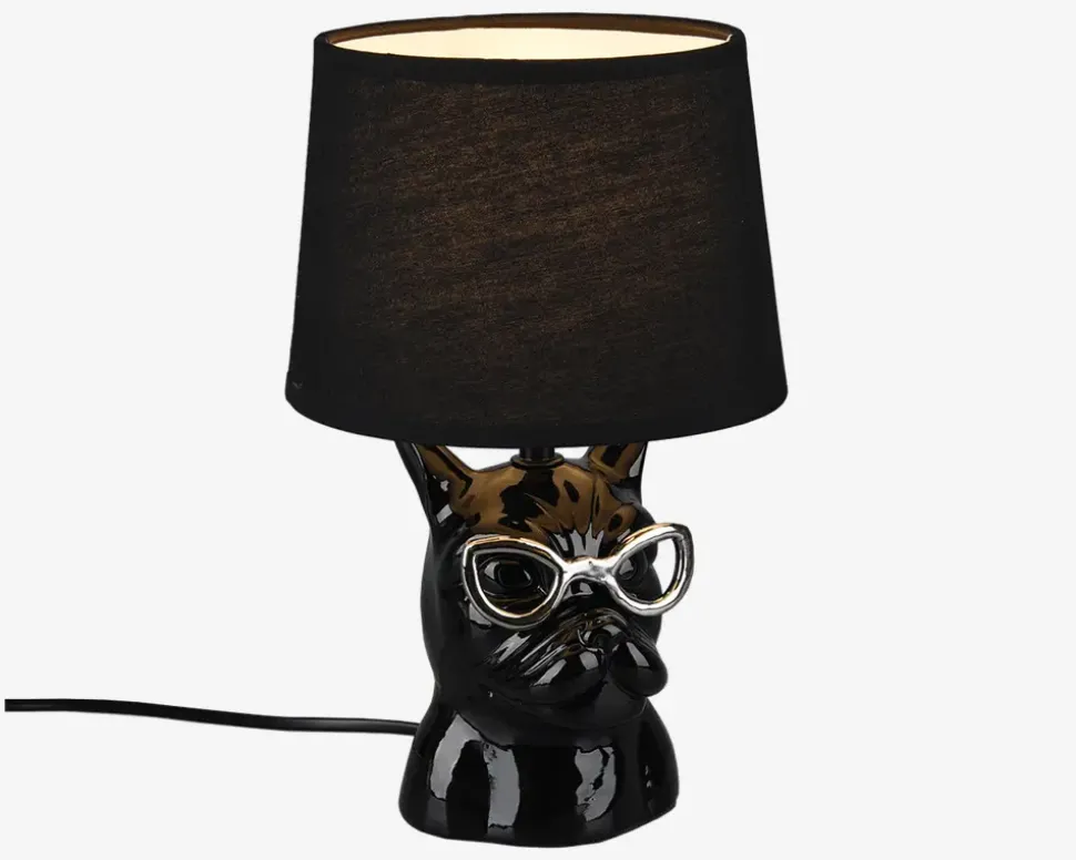Her har du en sjov bordlampe, som med sit utraditionelle design er mere en pyntefigur end en lampe. Lampen vil vække opsigt uanset om du bruger den på teenageværelset eller et andet sted i hjemmet, hvor du ønsker at give indretningen lidt kant.• Mål i cm: H.29 x Ø.18• Farve: sort• Materiale: keramik/stof• Fatningstype: E14, maks. 40W• Ekskl. Lyskilde• IP20• Ledningslængde: 150 cm