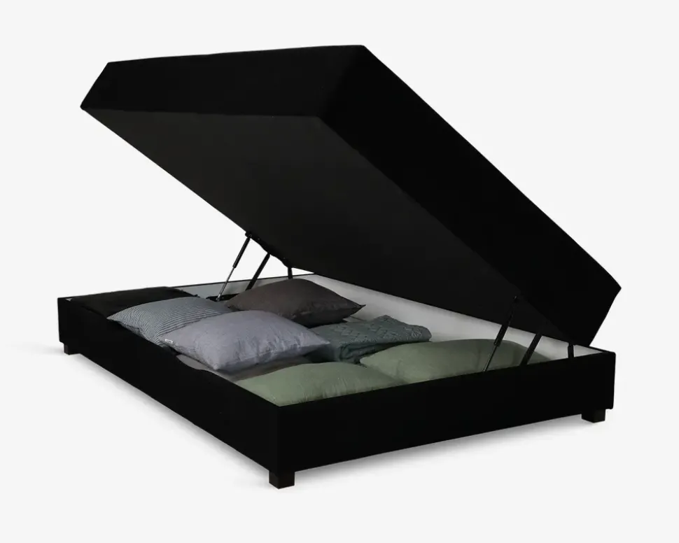 Denne boxmadras med magasin er beklædt med slidstærkt møbelstof i sort. Boxmadrassen er perfekt til både ungdomsværelset, studielejligheden og sommerhuset, den giver både en god soveplads, og masser af plads til opbevaring af ekstra dyner, tasker og lignende. Selve magasinet er monteret på en base fremstillet af lamineret spånplade, beklædt med slidstærkt møbelstof.Madrassen er monteret på basen med kraftige beslag, og løftefunktionen lettes af en gasfjeder som letter arbejdet med at åbne og lukke til magasinet. Bemærk de fine udskæringer i magasinet, som forhindre at du får fingrene i klemme, når du åbner og lukker.Selve madrassen består af et fjederindlæg bestående af 231 posefjedre pr. m². Posefjedre er individuelt indpakket, og giver derfor den bedst mulige støtte til din kroppen, igennem hele natten.Polstringen er en 25 kg. polyetherskum, som giver en behagelig komfort.Topmadrassen består af 30 mm profileret polyetherskum, beklædt med quiltet stof i 100% polyester. Betrækket på topmadrassen kan afmonteres og vaskes ved 40°.Denne boxmadras med magasin giver en ny mening til konceptet med at opbevarer ting under sengen, du har her mulighed for at opbevare dine ting, på en pæn og ryddelig måde.• Magasin base i lamineret spånplade• Boxmadras med 231 posefjedre pr. m².• Topmadras i profileret polyetherskum• Betræk på topmadras kan vaskes• Mål i cm.: H. 62 x B. 140 x L. 200• Sælges komplet inkl. ben og topmadras• Leveres samlet