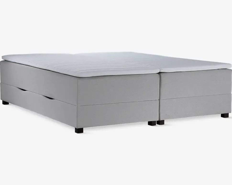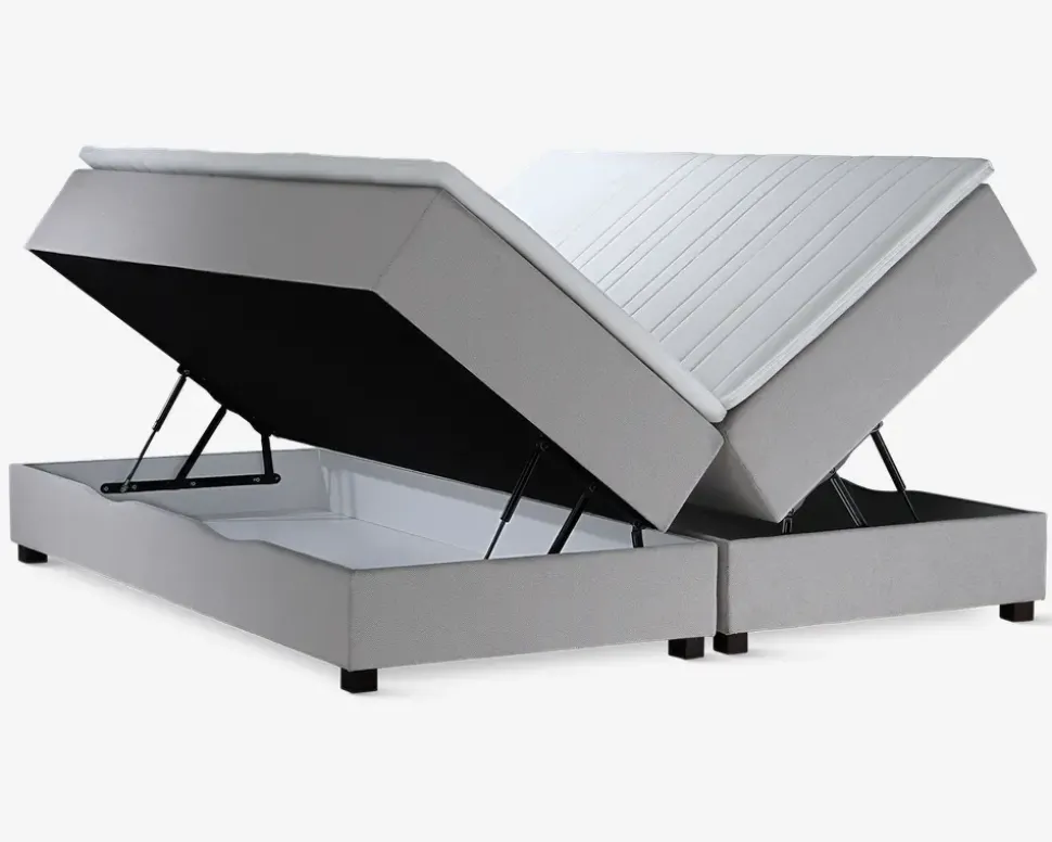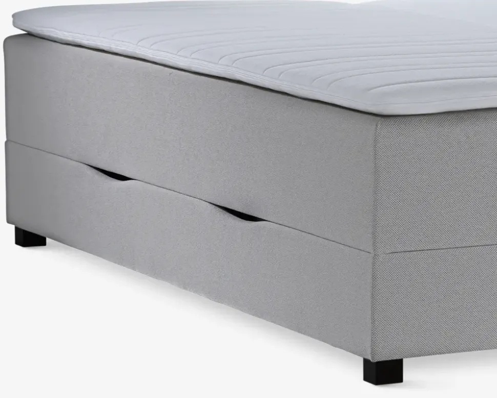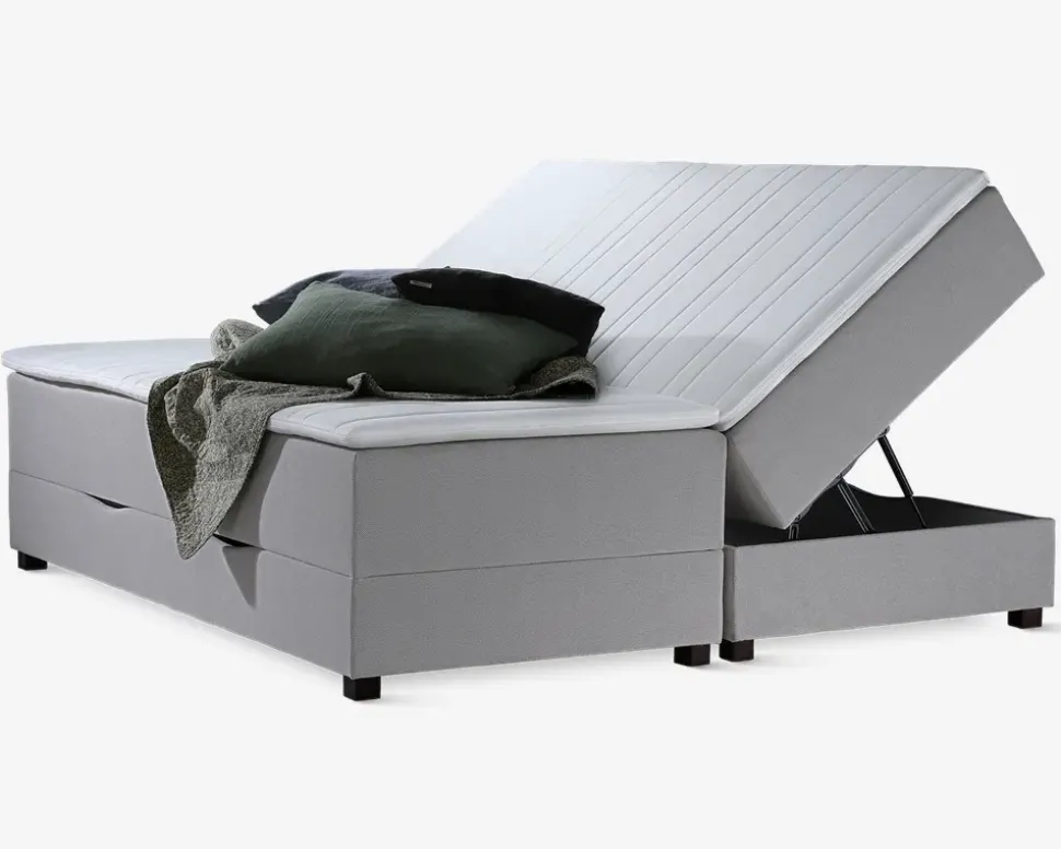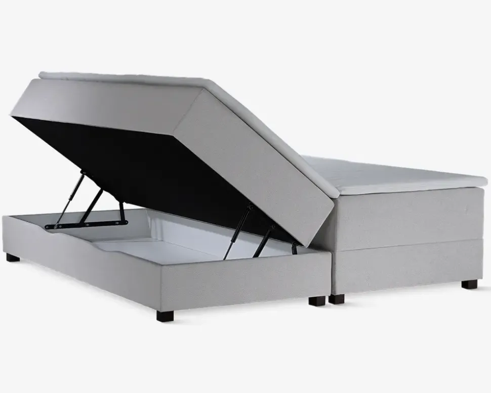 Denne seng består af 2 boxmadrasser med magasin som er beklædt med slidstærkt møbelstof i beige. Boxmadrasserne er perfekt til både ungdomsværelset, studielejligheden og sommerhuset, den giver både en god soveplads, og masser af plads til opbevaring af ekstra dyner, tasker og lignende. Selve magasinet er monteret på en base fremstillet af lamineret spånplade, beklædt med slidstærkt møbelstof.Madrasserne er monteret på basen med kraftige beslag, og løftefunktionen lettes af en gasfjeder som letter arbejdet med at åbne og lukke til magasinet. Bemærk de fine udskæringer i magasinet, som forhindre at du får fingrene i klemme, når du åbner og lukker.Selve madrassen består af et fjederindlæg bestående af 231 posefjedre pr. m². Posefjedre er individuelt indpakket, og giver derfor den bedst mulige støtte til din kroppen, igennem hele natten.Polstringen er en 25 kg. polyetherskum, som giver en behagelig komfort.Topmadrassen består af 30 mm profileret polyetherskum, beklædt med quiltet stof i 100% polyester. Betrækket på topmadrassen kan afmonteres og vaskes ved 40°.Denne boxmadras med magasin giver en ny mening til konceptet med at opbevarer ting under sengen, du har her mulighed for at opbevare dine ting, på en pæn og ryddelig måde.• Magasin base i lamineret spånplade• Boxmadras med 231 posefjedre pr. m².• Topmadras i profileret polyetherskum• Betræk på topmadras kan vaskes• Mål i cm.: H. 62 x B. 180 x L. 200• Sælges komplet inkl. ben og topmadras• Leveres samlet
