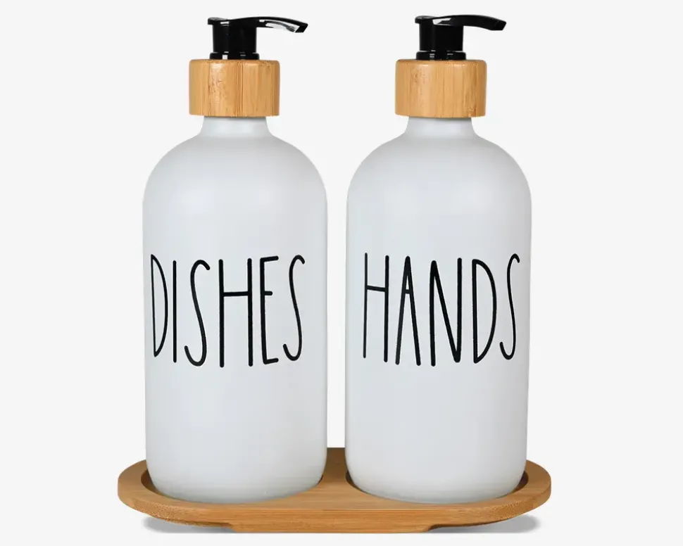 Hold dit køkken organiseret med dette praktiske sæbedispensersæt. Sættet indeholder to beholdere – én til sæbe og én til opvaskemiddel – så du nemt kan holde styr på dine daglige rengøringsrutiner. Beholderne er nemme at genopfylde og sikrer en jævn dosering af sæbe eller opvaskemiddel, så du undgår spild.
