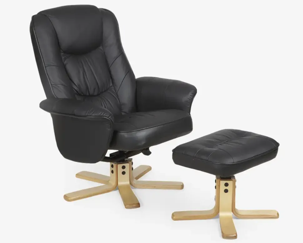Let og enkelt designet hvilestol inkl. Fodskammel. Stolen er monteret med ægte okselæder på alle slidflader. Stolen har trinløs dreje og vippefunktion som kan reguleres efter eget ønske. Flot sokkel i massiv naturfarvet træ. Elegant og let stol med et enkelt design og en god siddekomfort. Stolen fås også i cognac farvet.• Okselæder på alle slidflader• Dreje og vippefunktion• Rigtig god siddekomfort• Massiv naturfarvet sokkel• Mål i cm: B.81 x D.71 x H.45/100