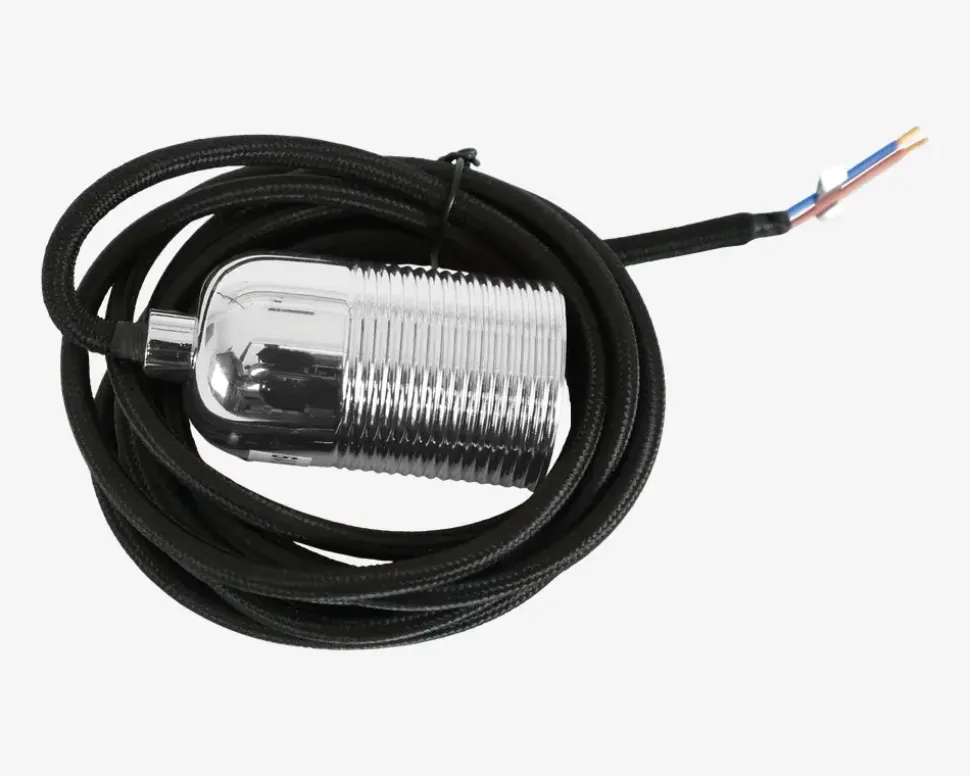 Fatningssæt med krom atning og sort stofledning. Kom en flot dekorationspære eller filamentpære i og lad både pære og fatning skabe blikfang i indretningen.• Mål i cm: Ø.40• Farve: krom• Materiale: metal• Fatning: E27, Max 40W• Ekskl. Lyskilde• Ledningslængde: 250 cm