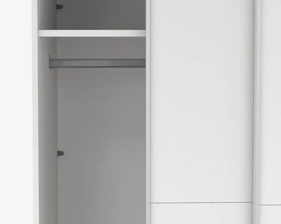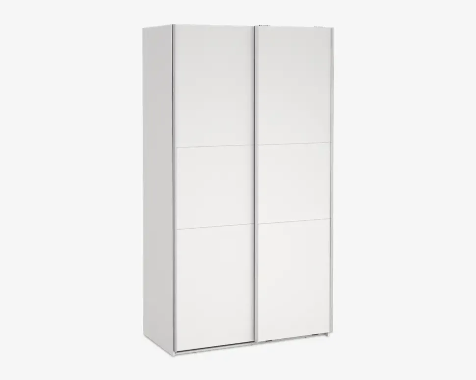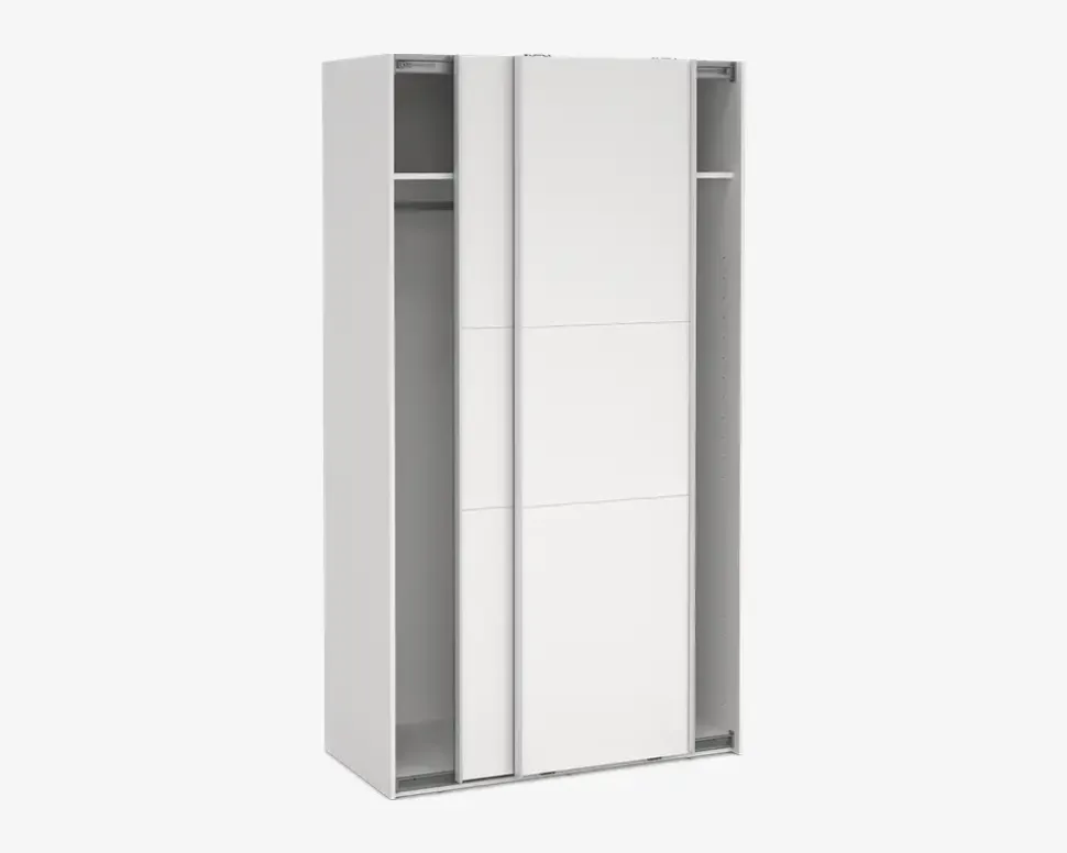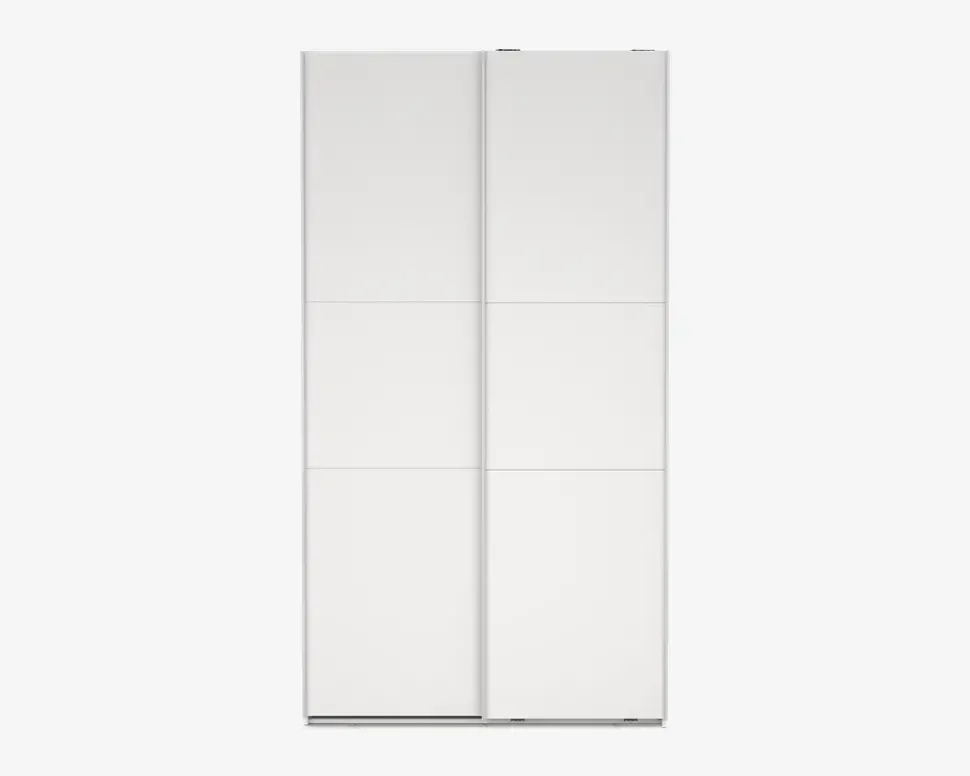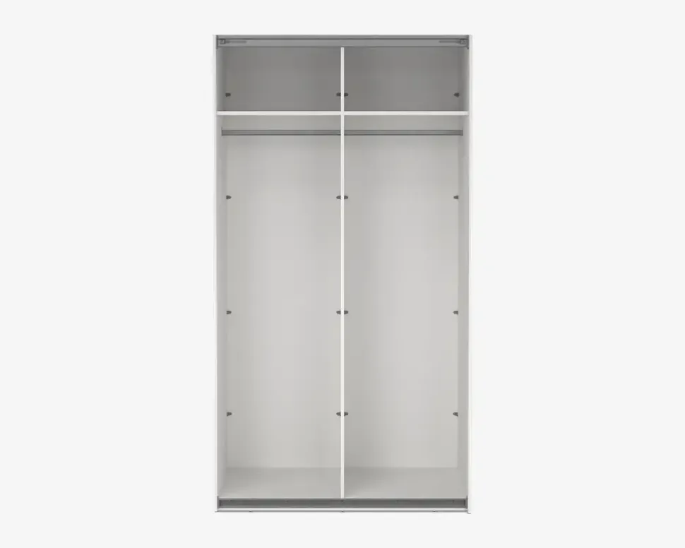 Her for du et virkelig rummeligt garderobeskab, som findes i flere bredder, så det er nemt at kombinerer, hvis du ønsker et stor garderobeskab, eller blot ønsker den samme type skab i hele huset. Dette garderobeskab måler H. 221 x B. 119 x D. 67 cm. Det indeholder to rum, i hvert af disse er der en fast hylde, samt en bøjlestang. De to skydelåger, glider nemt og sikre en eksklusiv følelse når du åbner og lukker skabet.Der kan tilkøbes både ekstra hylder, skuffeindsatser, samt dørdæmpere, som vil øge den eksklusive følelse yderligere, når du åbner og lukke skabet. hvis du ønsker det kan den ene eller begge låger udskiftes til spejllåger, så kort sagt et skabsserie med mange muligheder.Skabsserien udmærker sig ved at den monteres oprejst, det giver bedre mulighed for at udnytte den totale lofthøjde i rummet, ligesom den kan samles på stedet, og ikke efterfølgende skal skubbes på plads, med risiko for skader på både møbel og gulvbelægning. Vi anbefaler at I er 2 når skabet skal samles. Garderobeskabet kræver ingen vedligeholdelse, og rengøringen foretages med en klud vredet op i rent vand.