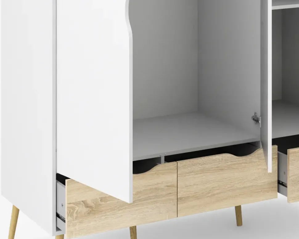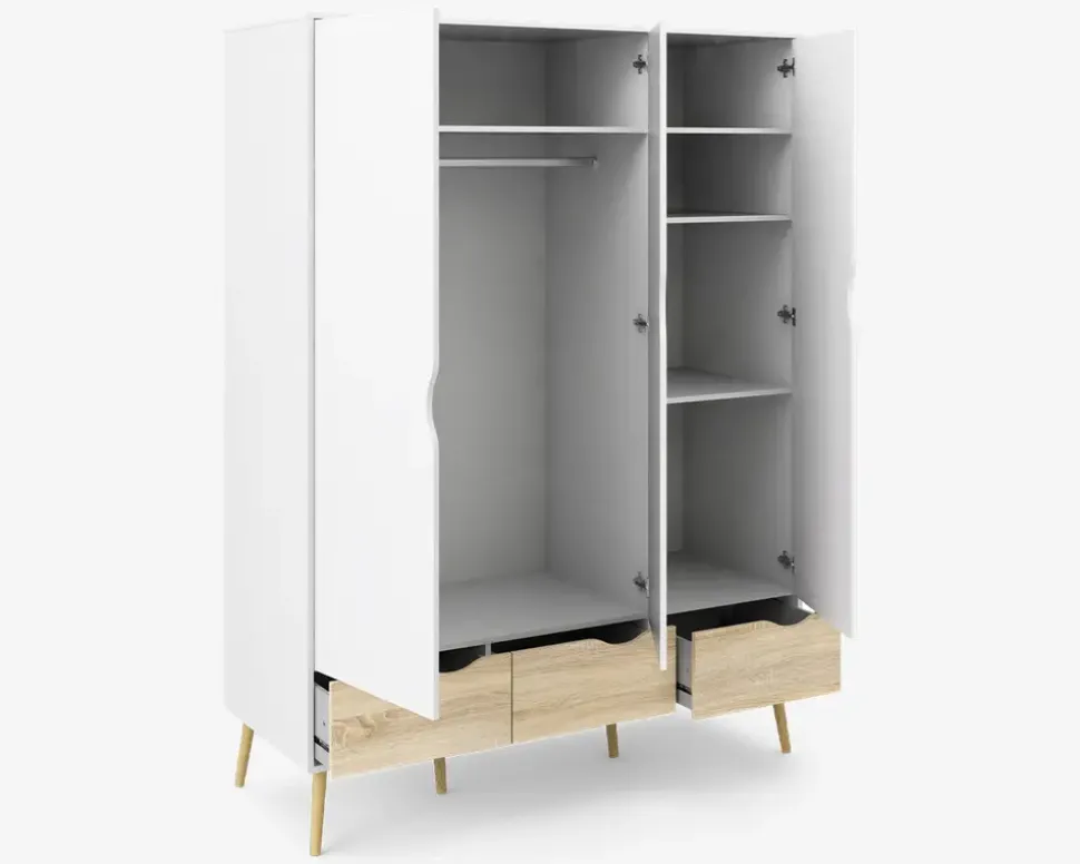 Delta garderobeskabet er fremstillet i et moderne design og velegnet til mange formål i hjemmet. Garderobeskabet er perfekt til ungdoms eller studieværelset, det indeholder 3 skuffer, 1 bøjlestang og 3 smalle hylder samt en bred hylde. Du får således god opbevaringsplads til værelset, der er masser af hænge plads, rimelig med hyldeplads og god skuffeplads. Skabet er færdigindrettet og der kan ikke tilkøbes ekstra hylder. Lågerne er monteret med kraftige møbelbeslag, som gør at de tåler at blive åbnet og lukket mange gange, og de 3 skuffer kører på kugleleje skinner som tåler at du fylder op til 8 kg i hver skuffe. Skabet er løftet fra gulvet med ben i massiv træ, det er med til at lette den daglige rengøring i værelset.Garderobeskabet er fremstillet i hvid kunstfiner, som udover at være vedligeholdelsesfri, også er nemt at rengøre, og tåler alle former for rengøringsmidler, hvis de blot ikke indeholder slibemidler, dette kan være en fordel hvis dit barn vælger at bruge den flotte hvide overflade som lærred til et stor flot tegning.Delta er en serie af møbler med et moderne udtryk. Alle møblerne i serien er fremstillet i kunstfiner som er vedligeholdelsesfrit, og nemt at rengøre. I serien findes der møbler til alle rum, og den henvender sig til kunder i alle aldre, som ønsker et frisk pust til indretningen.• Indeholder: 1 bøjlestang, 4 hylder og 3 skuffer• Der findes ikke ekstra tilbehør til skabet• Står på ben for let rengøring• Mål i cm: H.200,1 x B.147,2 x D.58,1• Leveres usamlet