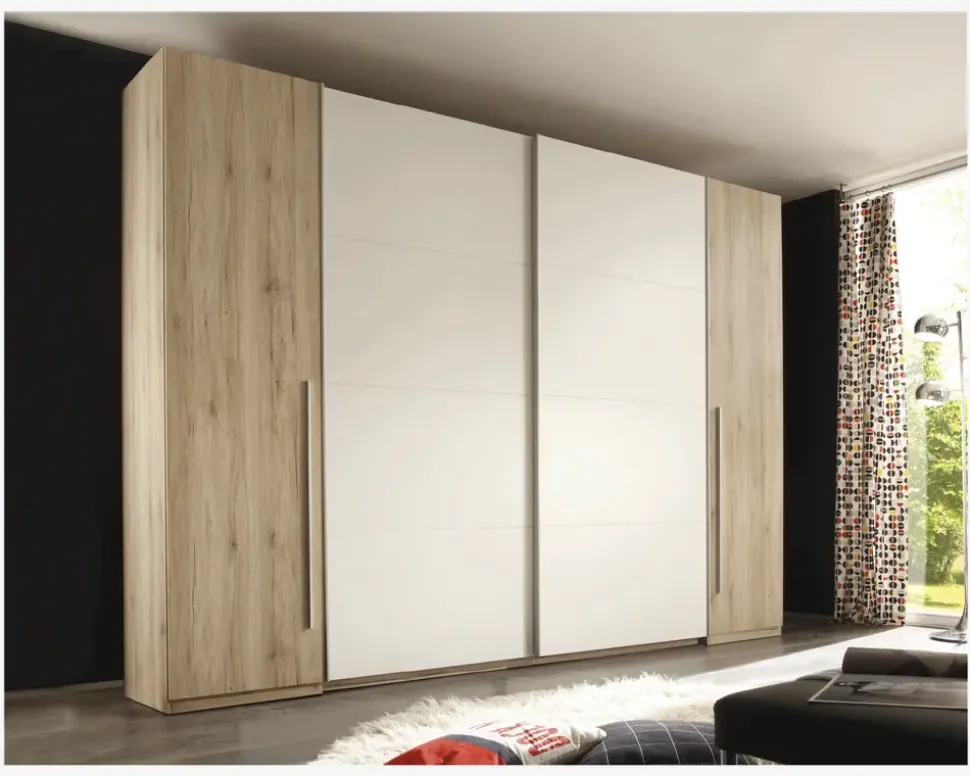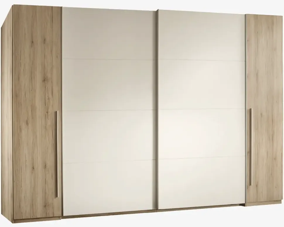 Stort garderobeskab som er fremstillet med korpus i antikfarvet ege kunstfiner, og front i henholdsvis antikfarvet eg kunstfiner, og hvid kunstfiner. De 2 døre i kunstfiner er hængslede døre, mens de 2 hvide døre er skydedøre.Skabet giver masser af opbevaringsplads til den moderne familie, de 2 hvide skydedøre gemmer sig i hvert rum en hylde og en bøjlestang, mens der bag de hængslede døre i siden er 4 hylder bag hver dør. Skabet giver således meget både hylde og hængeplads. Der kan ikke tilkøbes ekstra hylder, men hvis du både har brug for masser af hylde plads, og bøjlestangsplads, kan det her være det helt rigtige skab for dig.Skabet leveres usamlet, men hvis I er 2 om opgaven og følger den vedlagte samlevejledning, samles det forholdsvis nemt. Vi anbefaler 2 til samlingen af hensyn til højden og størrelsen på skabet, så du undgår skader, både på dig selv, skabet og væggene. Skabet samles hvor det skal stå, så du skal ikke efterfølgende flytte på det. Hvis du har gulvtæppe på gulvet, kan du med fordel fastgøre skabet i væggen med et par vinkelbeslag.Skabet kræver ingen vedligeholdelse, og den daglige rengøring foretages med en støvsuger (med børstehoved på), eller en klud vredet op i rent vand.• 8 smalle hylder, 2 brede hylder samt 2 bøjlestænger• Der kan ikke købes ekstra hylder• Mål i cm. H. x B. x D.: 225 x 270 x 61,1• Leveres usamlet.