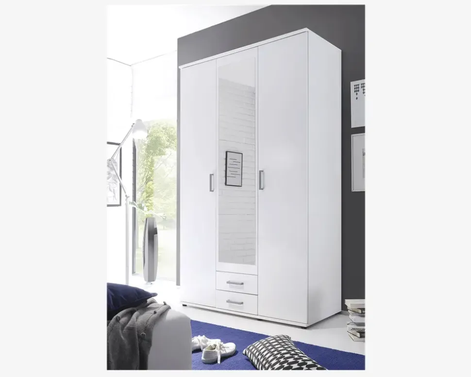 Garderobeskab som er perfekt til den lille lejlighed, børne- eller gæsteværelset. Skabet er fremstillet i hvid kunstfiner, og leveres med to skuffer, to trædøre samt en spejldør. Garderobeskabet måler B.120 x H.195 x D.51 cm, og leveres usamlet. Garderobeskabet samles uden problemer, hvis du følger den vedlagte samlevejledning. Vi anbefaler altid at I er 2 om at samle skabet, så I undgår skader, både på produktet og på jer selv under samlingen. Vi anbefaler ligeledes at skabet fastmonteres i væggen, det vil både gøre skabet stabilt, og samtidig være en forebyggelse mod at skabet vælter, hvis der bliver kravlet op på skabets hylder.Skabet er færdigindrettet, og der kan ikke tilkøbes yderligere hylder. Bag de to døre til højre indeholder skabet en hylde samt en bøjlestang, og bag døren til venstre er skabet udstyret med 3 hylder, som kan justeres lidt i højden. Skabet giver med sin indretning plads både til bøjletøj kort og langt, tøj som du gerne vil have i skuffe, og endelig tøj som du ønsker at opbevare på hylder.• 4 hylder• 1 Bøjlestang• Mål i cm: H.195 x B.120 x D.51• Findes også i eg kunstfiner• Leveres usamlet