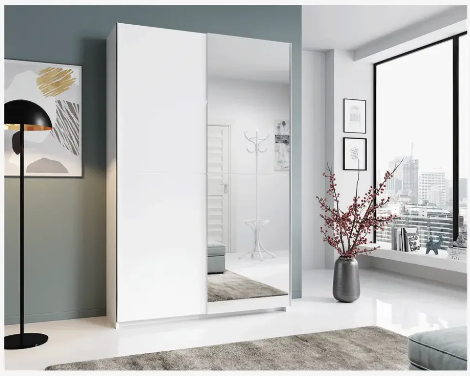 Et lille garderobeskab til værelset hvor pladsen er trang, men behovet for opbevaring af tøj er stort. Garderobeskabet har 2 skydedøre en i hvid kunstfiner, og en i spejl. Skabet er opdelt i 2 lige store rum, den ene side indeholder 1 hylde og udtræksbøjlestang, mens den anden side indeholder i alt 5 hylder. Garderobeskabet fås som her i hvid kunstfiner, men du kan også vælge det i eg kunstfiner, eller uden spejllåge, hvis det passer bedre ind i dit soveværelse. Skabets dybde på kun 38 cm, gør det særdeles velegnet i det lille børneværelse, sommerhuset eller soveværelset som ikke er så stort.Garderobeskabet er fremstillet med et korpus og døre i hvid kunstfiner. Garderobeskabet kræver ingen vedligeholdelse, og rengøres med en klud vredet op i rent vand, hvis skabet kræver ekstra rengøring kan du uden problemer bruge spejlrens, til at fjerne genstridige mærker med. Garderobeskabet leveres usamlet, og vi anbefaler at I er to til at samle skabet. Skabet måler H.196 x B.125 x D.38 cm, og er derfor også meget velegnet til huse hvor loft højden er lav.• Let kørende skydedøre• Indeholder 6 hylder og 1 udtræksbøjlestang• Der kan ikke tilkøbes ekstra hylder• Mål i cm.: H.196 x B.125 x D.38• Leveres usamlet