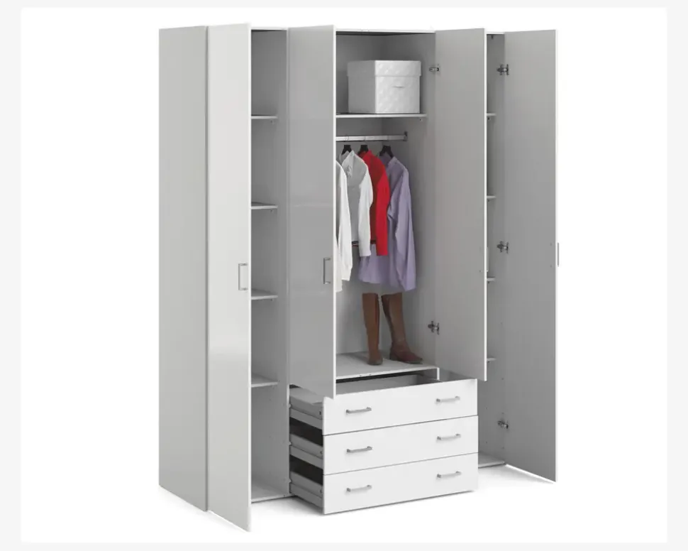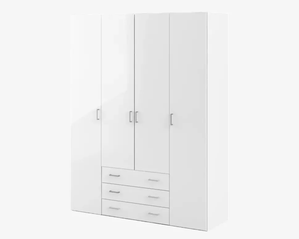 Space er en serie af garderobeskabe som findes i 3 størrelser. Space udmærker sig ved at være en serie af skabe i en fornuftig kvalitet, til en super god pris. Skabene leveres komplet med indretning, og der kan ikke tilkøbes ekstra hylder til skabene. Garderobeskabet er fremstillet med korpus i hvid kunstfiner, og front i hvid højglans kunstfiner.Dette space skab er giver god plads til opbevaring af alt dit tøj. Skabet her måler 154 cm i bredden og indeholder 3 rum, 1 rum som er 74 cm i indvendig bredde indholdende 3 skuffer, 1 hylde og 1 bøjlestang, samt 2 rum som er 37 cm i bredden og begge indeholde 4 hylder. Skabet giver således ikke plads til de lange selskabs kjoler, men ellers har du gode muligheder for at opbevarer hele garderoben. Det er ikke muligt at tilkøbe ekstra hylder, og skufferne skal sidde i midten af skabet. Skabet kan kombineres med de øvrige skabe i serien, hvis du har behov for mere skabsplads.• Produceret i Danmark• 9 hylder, 3 skuffer og 1 bøjlestang• Mål i cm.: H.200,4 x B.154 x D.49,8• Leveres usamlet
