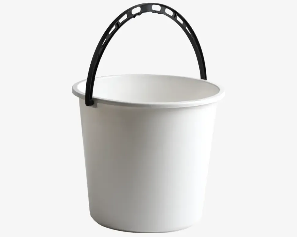 Rund hvid spand med sort hank, som kan bruges til rengøring i hjemmet eller andre steder. Spanden kan indeholde 10 liter.