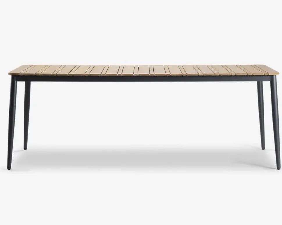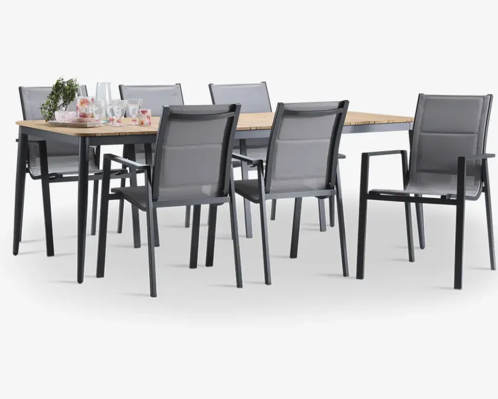 At spise ved et rektangulært havebord er helt perfekt, man kan se hinanden i øjnene, og man har en makker ved siden af man kan snakke med og få mange nogle hyggelige middage med en god bøf og lidt vin. Dette dejlige bord giver masser af plads til 8-10 personer, det kan ikke udvides. Bordet er fremstillet af et stel i antracit lakeret aluminium, og en bordplade bestående af lameller i massiv teaktræ som er lagt i et flot mønster. Bordet fås i 3 størrelser. Her er bordet vist i 100×210 cm.Man kan behandle borde i teaktræ med olie for at beholde den mørke glød i farven. Og det vil helt sikkert forlænge levetiden. Vi anbefaler at havebordet opbevares overdækket, tørt og frostfrit uden for sæsonen, da dette vil forlænge levetiden betragteligt. Eg god ide er at give bordet en omgang olie når det tages frem efter vinteren.• Nem at samle• Massiv bordplade i teak• Stel i aluminium• Mål i cm: H.75 x B.100 x L.210• Bør opbevares overdækket, tørt og frostfrit uden for sæsonen