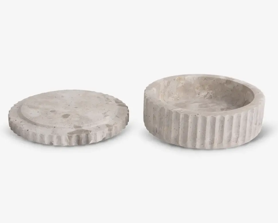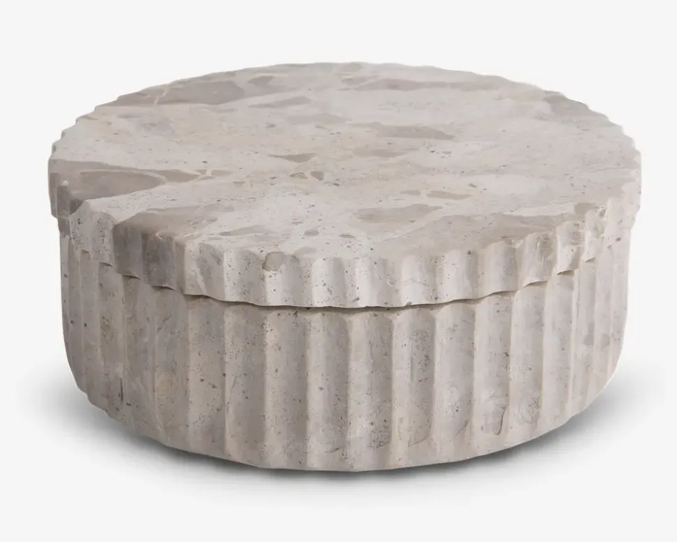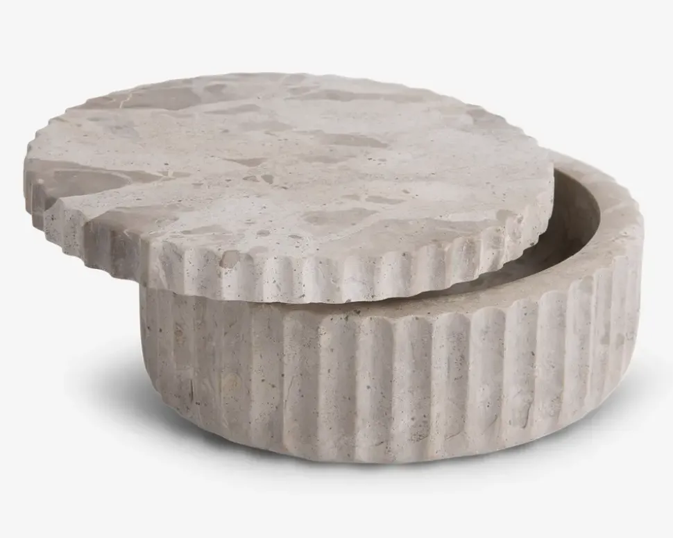 Opbevaringskrukke i marmor, der kombinerer funktionalitet med et stilfuldt udtryk. Krukken er ideel til opbevaring af småting som smykker, nøgler eller andre personlige genstande og tilføjer et eksklusivt touch til indretningen. Den naturlige marmorering gør hver krukke unik, og den passer perfekt på badeværelset, natbordet eller i stuen.