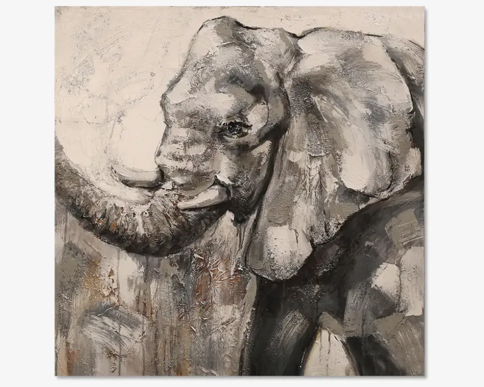 Stemningsfuldt maleri af en elefant i afdæmpede grå toner. Det kvadratiske format på 80×80 cm gør det nemt at placere på både små og større vægge. Motivet tilfører rummet karakter og ro og passer perfekt til stuen, kontoret eller soveværelset. Et flot og dekorativt valg for dig, der ønsker dyreinspireret kunst.
