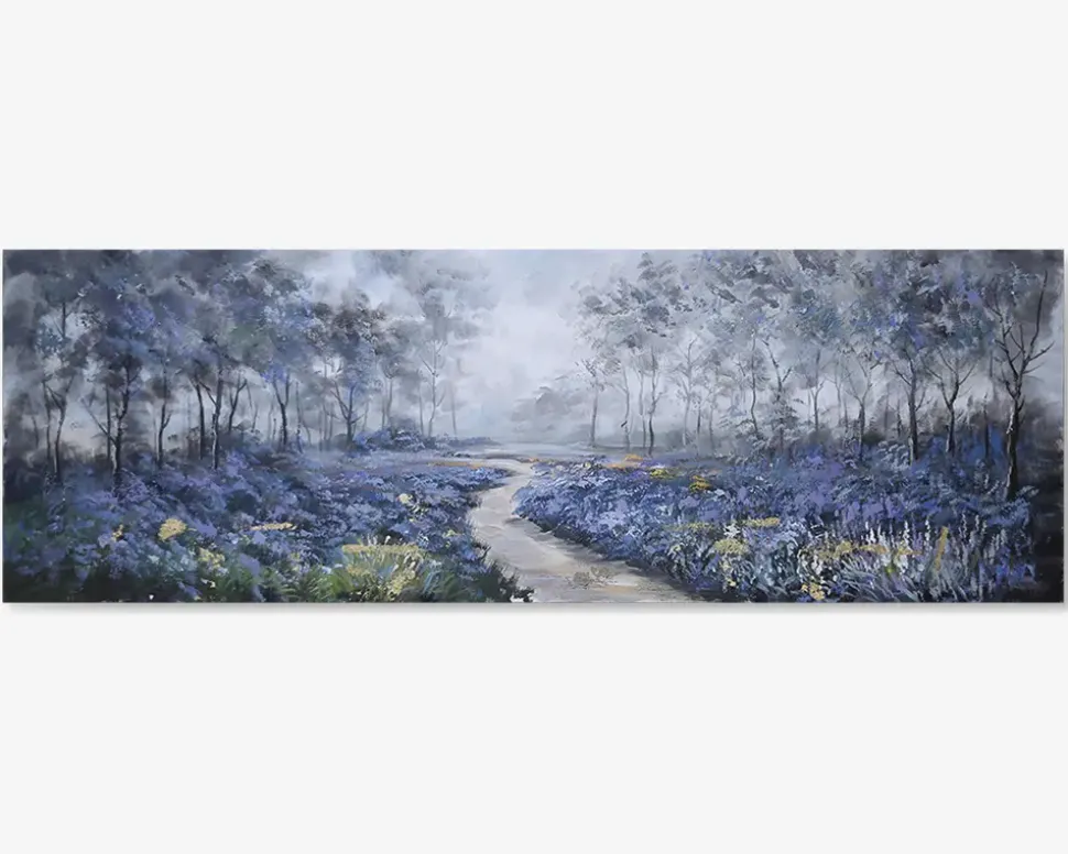 Maleri med motiv af en sti omgivet af træer, der måler 50×150 cm. Maleriet skaber en rolig og naturlig stemning, perfekt til at bringe et strejf af natur ind i hjemmet. Velegnet til både stue, entré eller kontor for et fredfyldt og indbydende udtryk.