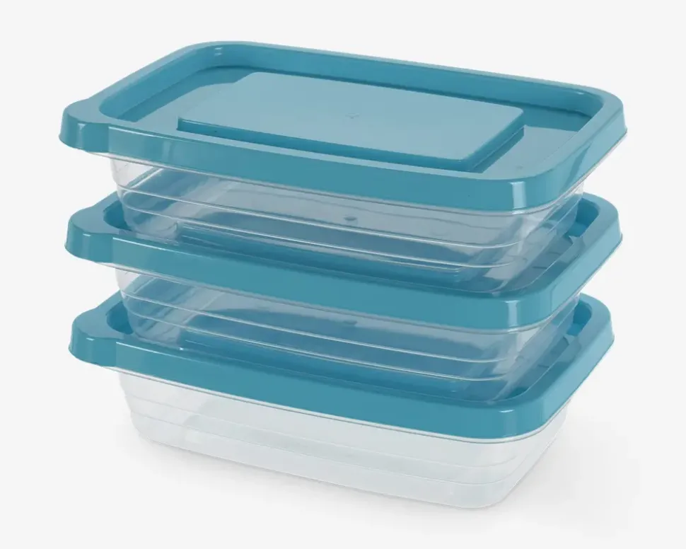 Opbevaringsboks sæt med 3 kasser i klar plast med blå låg. Madvarerne opbevares optimalt i denne lufttætte beholder og de er særligt velegnet til fryser og køleskab. Nemt og hurtigt at rengøre ved maskinopvask. Kommer i sæt med 3 stk.