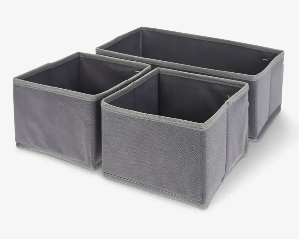 Sæt med 3 opbevaringskasser i grå. Sættet indeholder én stor kasse der måler 28x14x11 cm og to mindre kasser der måler 14x14x11 cm. Perfekte til at holde orden i skuffer, skabe eller på skrivebordet.