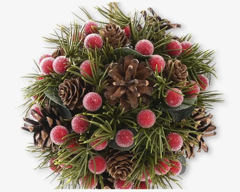 Ornament med kogler, kunstig gran og røde bær til ophæng.Denne ornament tilføjer et strejf af julestemning og naturens charme til dit hjem, uden at du behøver bekymre dig om vedligeholdelse.