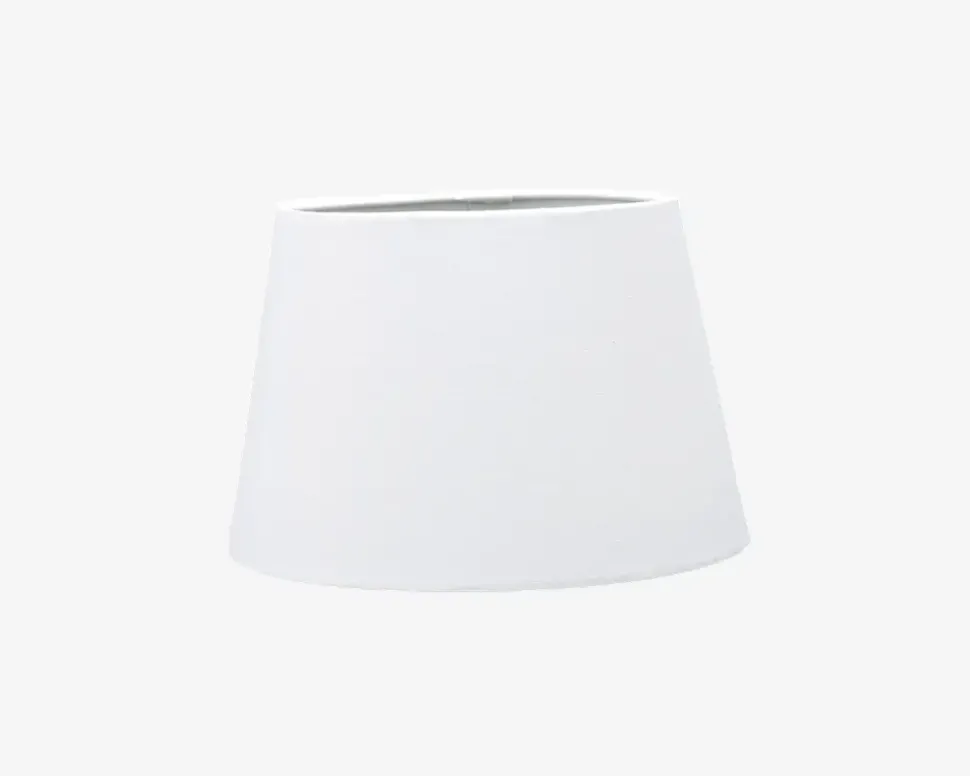 Enkel og klassisk hvid oval lampeskærm i bomuld som passer i ethvert hjem, da farven og skærmen er neutral. Lampeskærmen er særligt velegnet til en lampefod som kan købes fra sortiment. Lampeskærmen sættes på ved at to metalbøjler inde i lampeskærmen klikkes ned over pæren.