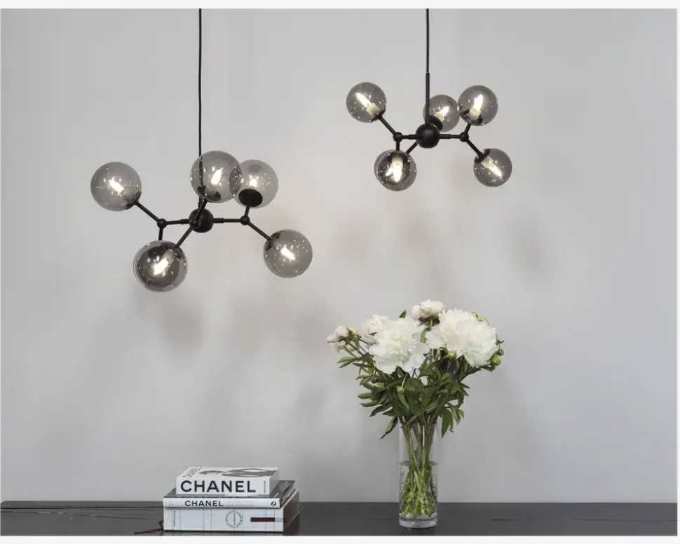 Atom pendlen fra Halo Design er en “form” for en lysekrone, hvor det rene design for lov at folde sig ud i fuld flor. Denne lampe har drejelige led på hver arm som gør det muligt dels at ændre designet på lampen samt dreje lyset hvorhen man ønsker der skal være lys. • Mål i cm: H.17,5 x Ø.4• Farve: Røgfarvet/sort• Materiale: Metal/Glas• Fatningstype: 6 x G9 maks 28W• Ekskl. Lyskilder