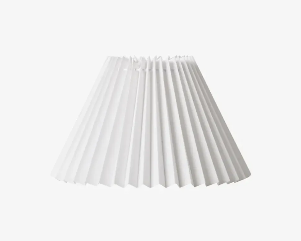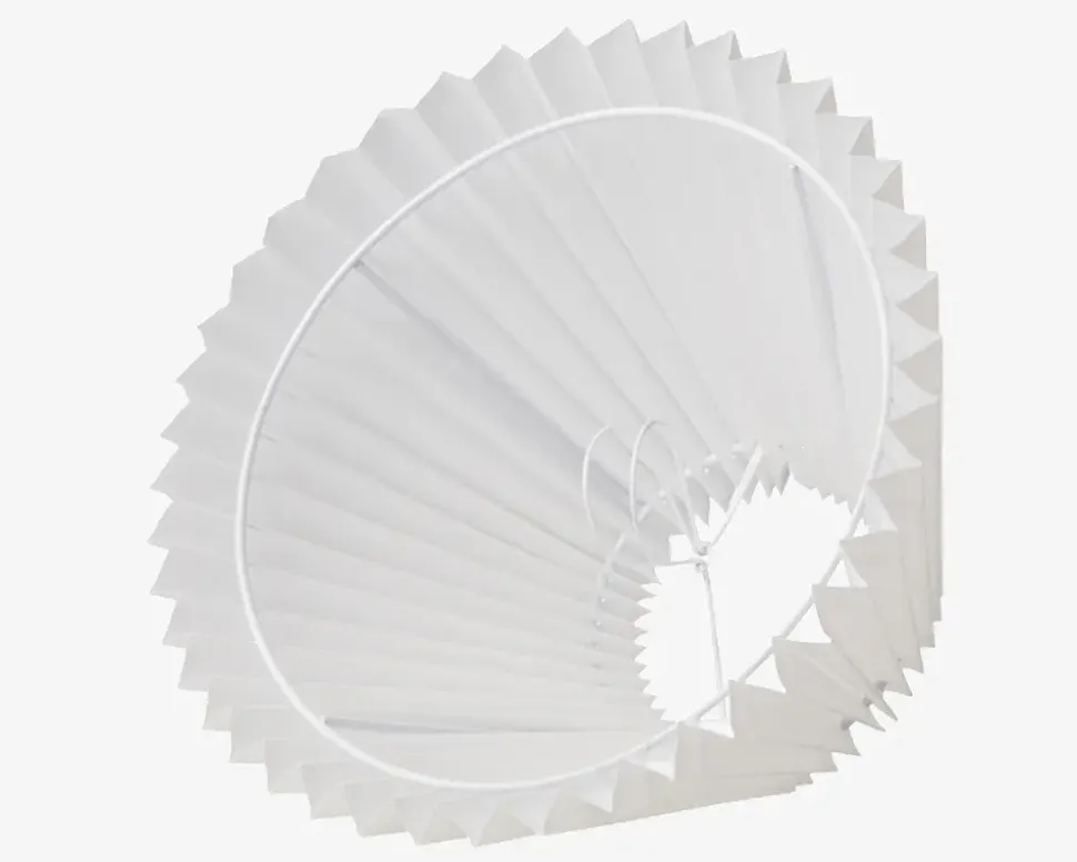 Flot og klassisk plisse lampeskærm af plastik , som passer ind i ethvert hjem, da farven er enkel og neutral. Lampeskærmen er særligt velegnet til en lampefod som kan købes fra sortiment. Lampeskærmen sættes på ved at to metalbøjler inde i lampeskærmen klikkes ned over pæren.