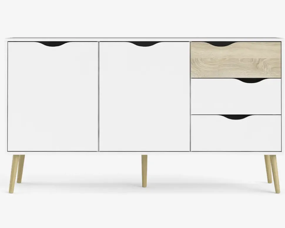 Denne smarte skænk i hvid/eg kunstfiner giver masser af plads til opbevaring i enten spisestuen eller køkkenet. Farve kombinationen passer perfekt sammen med en masse forskellige spiseborde og stole, og det lette skandinaviske design, vil passe flot ind i mange hjem. Materialerne sikre dig et møbel, som er nemt at rengøre og vedligeholde, kunstfiner tåler alle former for rengøringsmidler, undtaget rengøringsmidler med slibemidler i.Skænken har 2 døre, bag dem er der en løs hylde, samt 3 skuffer. Skænken er nem at samle, og du vil opleve en kvalitet som du kan have glæde af i mange år fremover.• Let og elegant design• Rengøringsvenlige materialer• Mål i cm.: H.82 x B.147 x D.40• Leveres usamlet, men samles nemt