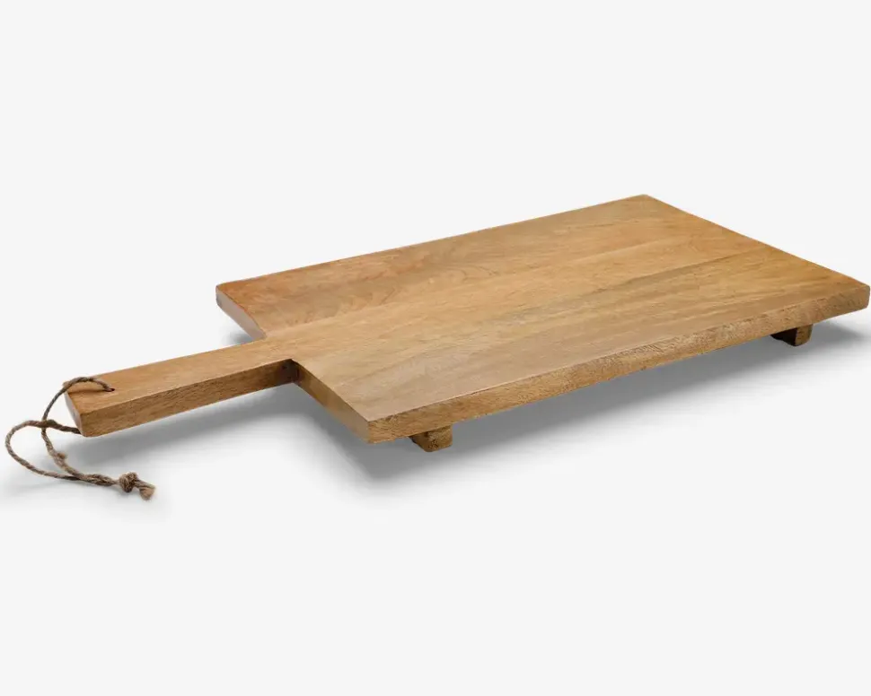 Skærebræt i træ der måler 61 x 30 cm og har en højde på 5 cm. De små ben løfter brættet fra bordet og giver det et robust og elegant udtryk. Perfekt til både madlavning og servering. Brug det f.eks. til anretning af tapas, brød eller grøntsager. Det solide træ giver skærebrættet en naturlig og holdbar overflade.