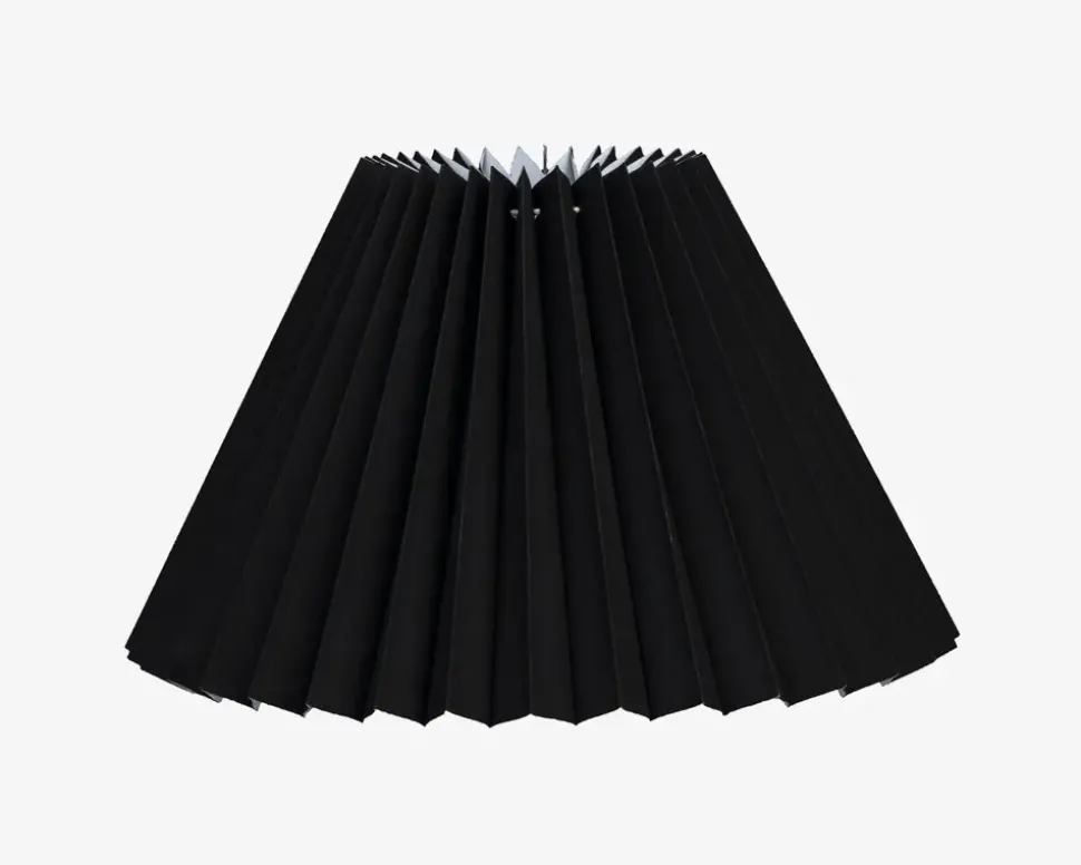 Flot og klassisk lampeskærm af stof/plastik , som passer ind i ethvert hjem, da den sorte farve er neutral. Lampeskærmen er særligt velegnet til en lampefod som kan købes fra sortiment. Lampeskærmen sættes på ved at to metalbøjler inde i lampeskærmen klikkes ned over pæren.