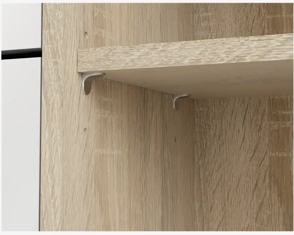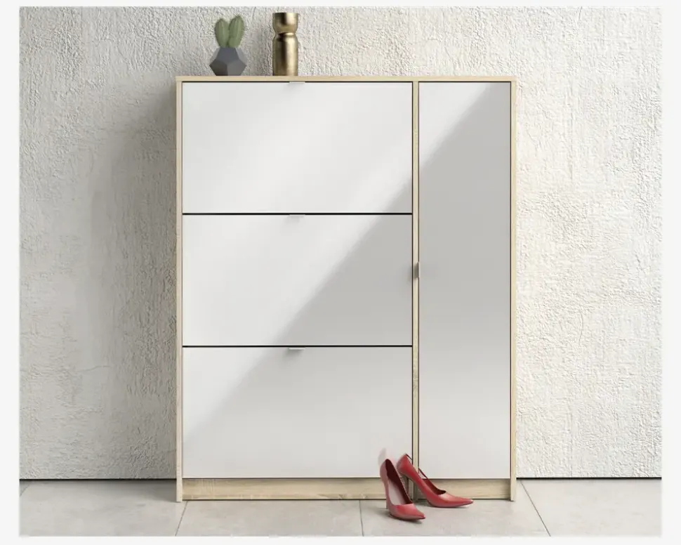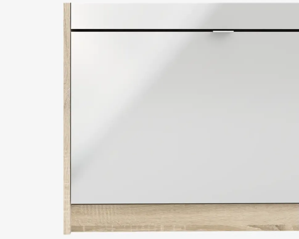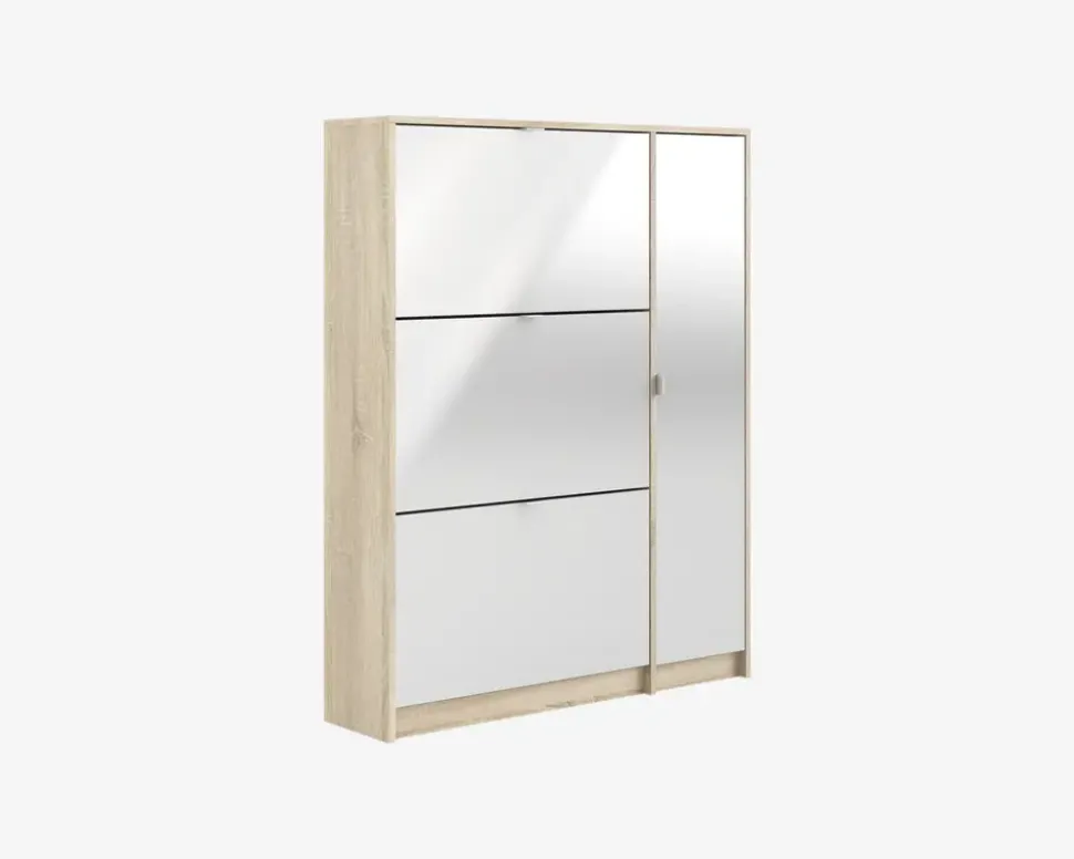 Et flot skoskab med 3 klaplåger, og 1 låge bag hvilken du finder 4 hylder. Skoskabet giver plads til 18 par sko i varierende størrelser. Hver låge har 2 rækker, så hvis du mangler opbevaringsplads til dine sko, har du her muligheden. Den almindelige låge gemmer på 4 hylder, som du både kan bruge til sko, hvis du ikke har plads nok, men de kunne også være oplagt til handsker og huer eller lignende. Skoskabet er en del af en serie bestående af skoskabe i forskellige størrelser, og de findes i flere forskellige farver, dette giver dig god mulighed for at finde en der passer hjem hos dig, uanset om det er størrelsen eller farven du ønsker at passe ind.Skoskabet er fremstillet i eg kunstfiner med front i hvid højglans Kunstfiner, som nemt rengøres, med en klud vredet op i rent vand. Der skal ikke bruges rengøringsmidler, er du uheldig og få et sål mærke på skabet, kan denne fjernes med en lille smule husholdningssprit på en klud. Sten og jord vil ridse skuffen indvendigt. Vi anbefaler grundet den lille dybde på skabet at det fastgøres til væggen, på den måde sikre du at skabet ikke vælter når du åbner den øverste låge. Skabet leveres usamlet, hvis du følger den vedlagte samlevejledning samles det nemt, men det tager lidt tid.• 4 hylder• Mål i cm.: H.123,6 x B.98,8 x D.24,05• Leveres usamlet