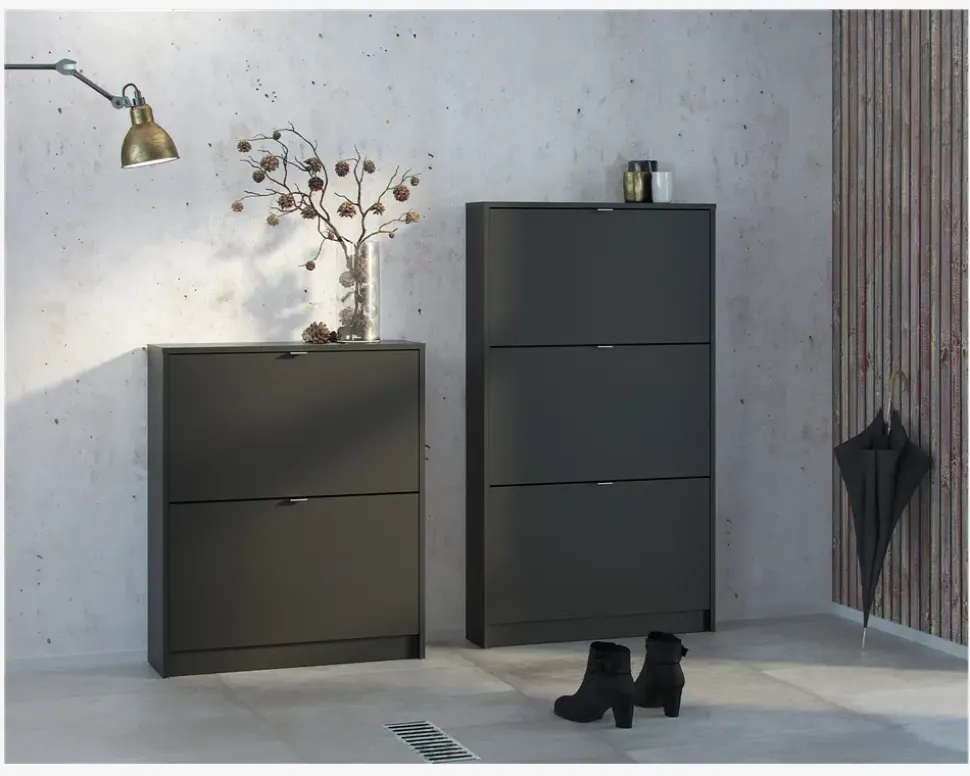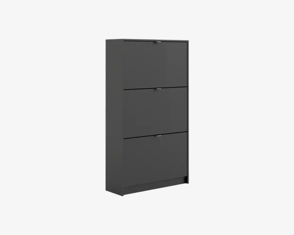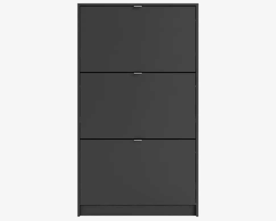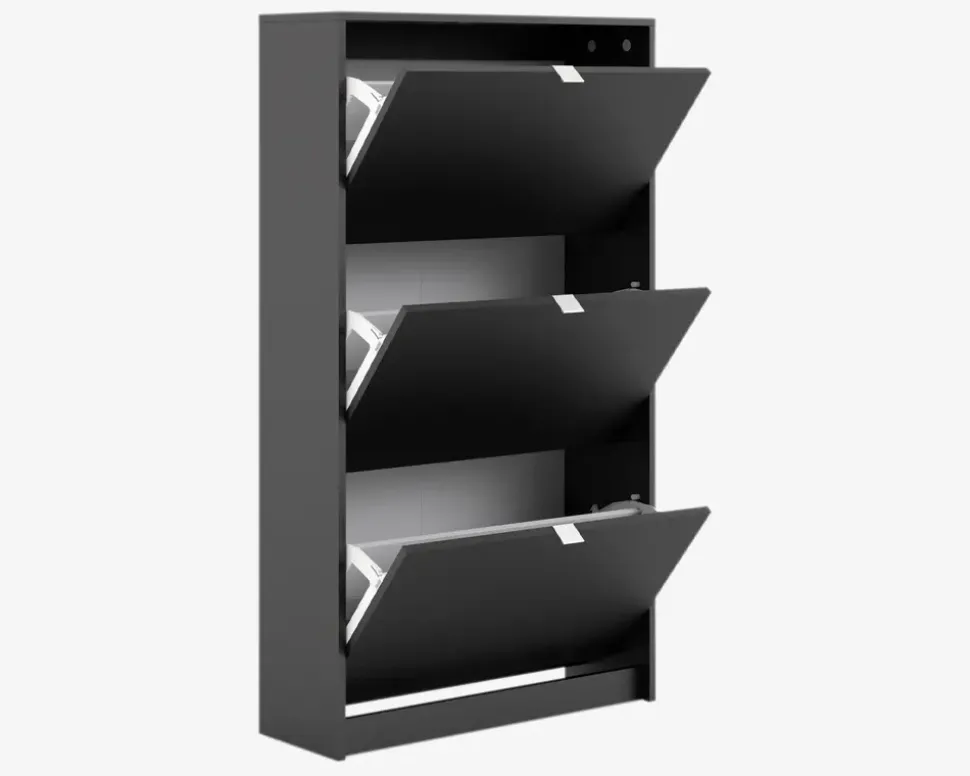 Et flot skoskab med 3 låger, som i alt giver plads til 18 par sko i varierende størrelser. Hver låge har 2 rækker, så hvis du mangler opbevaringsplads til dine sko, har du her muligheden. Skoskabet er en del af en serie bestående af skoskabe i forskellige størrelser, og de findes i flere forskellige farver, dette giver dig god mulighed for at finde en der passer hjem hos dig, uanset om det er størrelsen eller farven du ønsker at passe ind.Skoskabet er fremstillet i mat sort kunstfiner, som nemt rengøres, med en klud vredet op i rent vand. Der skal ikke bruges rengøringsmidler, er du uheldig og få et sål mærke på skabet, kan denne fjernes med en lille smule husholdningssprit på en klud. Sten og jord vil ridse skuffen indvendigt. Vi anbefaler grundet den lille dybde på skabet at det fastgøres til væggen, på den måde sikre du at skabet ikke vælter når du åbner den øverste låge. Skabet leveres usamlet, hvis du følger den vedlagte samlevejledning samles det nemt, men det tager lidt tid.• Findes i 3 farver• Findes i 3 højder• Mål i cm.: H.123,6 x B.70,3 x D.24,05• Leveres usamlet