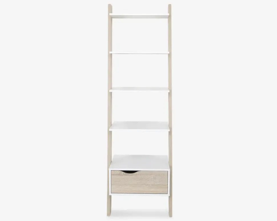 Smart skråreol i et let og elegant design. Hylder i hvid og vanger i eg kunstfiner. Den flotte farvekombination gør at det kan passe ind alle steder. I stuen, på børneværelset, ja alle steder hvor der er behov for lidt afsætningsplads. Leveres usamlet, men samles let.Reolen er en del af en stor serie af møbler, som har et moderne og smart udtryk, serien er fremstillet i rengøringsvenlige materialer, og kan både som enkelt møbel og som serie stå som et frisk pust til indretningen. Se hele det store udvalg af Delta møbler her eller i en af vores møbelhuse.• Let og elegant design• 1 stor skuffe• Rengøringsvenlige materialer• Leveres usamlet men samles let• Mål i cm. H.180 x B.55 x D.48