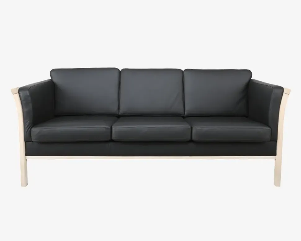 Klassisk sofa med massive gavle og frontramme i massiv sæbebehandlet bøg. Hynderne er i formstabilt polyether skum og monteret med ægte læder på alle slidflader. Sofaen har nozagfjedre i sæderammen som giver lang holdbarhed.Sofaen fås både som 3 pers. og 2 pers og derfor er den også oplagt at købe som sofasæt.• Formstabilt polyether i sædehynder• Nozagfjedre i sæderammen• Massive gavle og frontramme i sæbebehandlet bøg• Ægte læder• Mål i cm: L.196 x D.77 x H.84/45