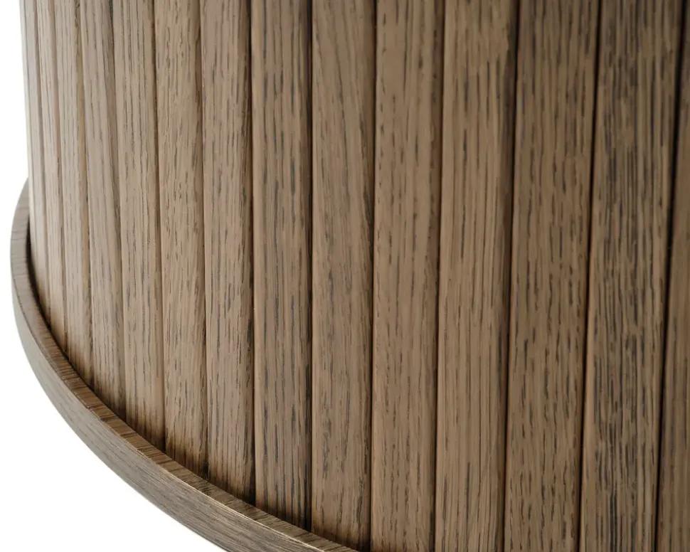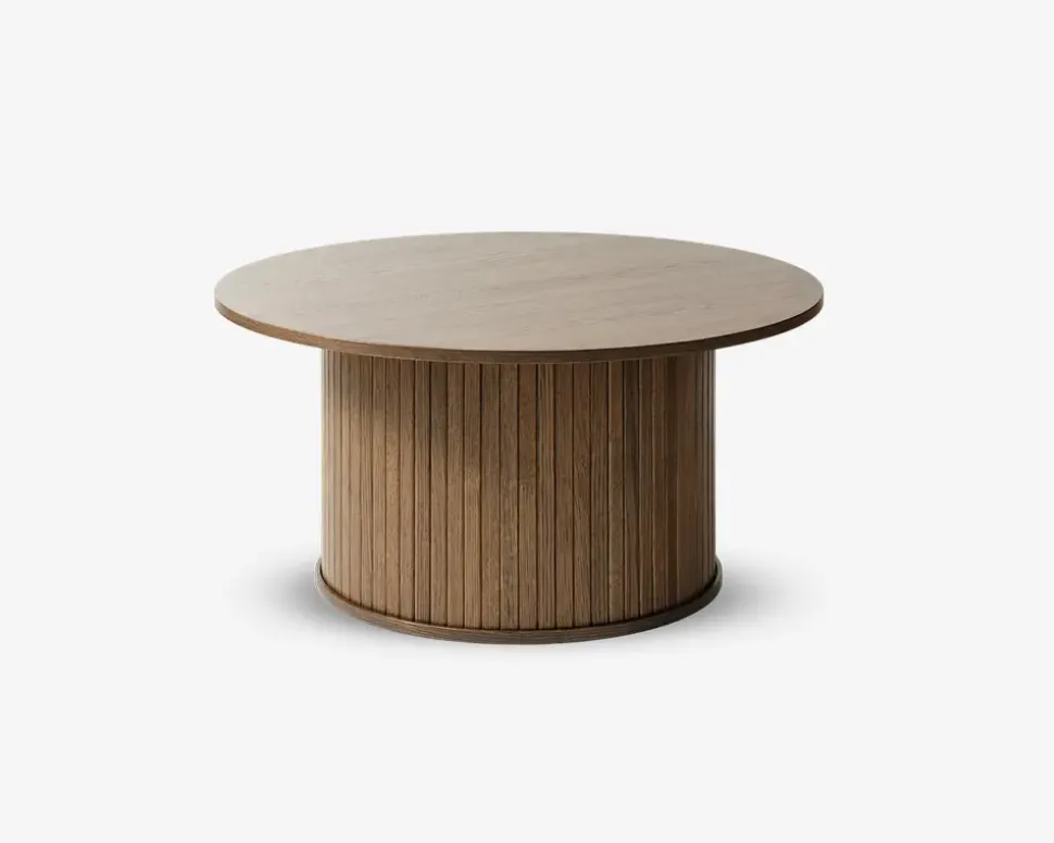 Smart sofabord i et klassisk og eksklusivt design. Bordets runde former og flotte træstruktur giver dette bord et naturligt udtryk som passer rigtig godt ind i din boligindretning. Bordet fås som her i røgfarvet eg finer, i naturfarvet eg og i sortlakeret eg finer og som et lille hjørnebord, selvfølgelig også i alle 3 farver. Så kan man virkelig skabe en smuk og iøjnefaldende indretning i stuen. • Smukt og klassisk design• Røgfarvet eg finer• Lamellook i soklen• Leveres usamlet men samles nemt• Mål i cm. DIA.Ø-90 x H.45