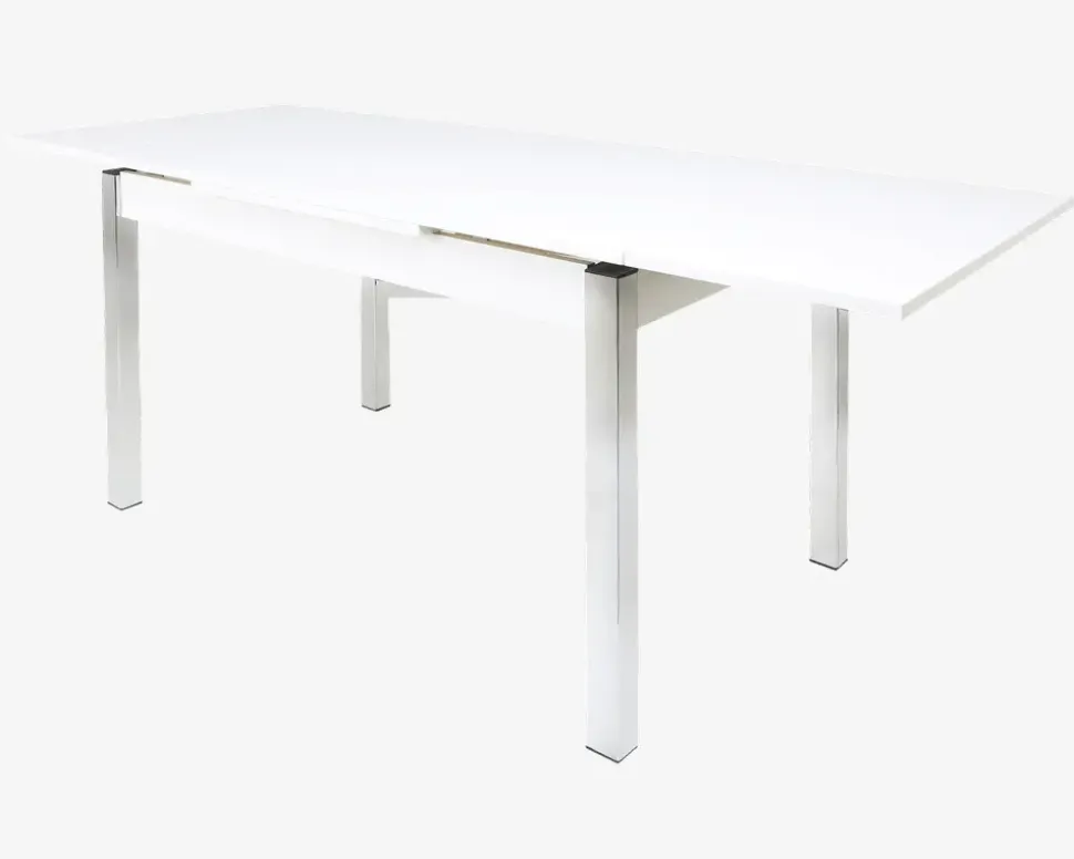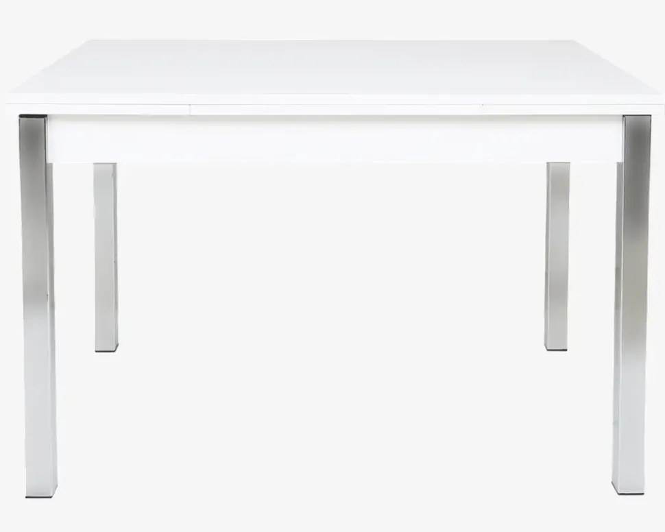 Smart lille spisebord i hvid/krom som passer perfekt ind i den moderne indretning. Spisebordet har hollandsk udtræk, som betyder at du kan trække en tillægsplade ud i begge ender af bordet, og derved få endnu mere spiseplads. Spisebordet måler B.80 x L.120 cm når det ikke er trukket ud, og det er en god størrelse, både hvis du skal bruge bordet i køkkenet, eller i den lille lejlighed. Der er god plads til 4 personer. Spisebordet udvides nemt med en udtræksplade i begge ender, og du får en længde på 187 cm, og det skulle give god plads til 6-8 personer. Bordpladens overflade er i hvid kunstfiner, den er ikke modtagelig overfor fedtede fingre, og du vil opleve et spisebord som er nemt og rengøre og som står flot i hjemmet.Kunstfiner overfladen udmærker sig ved at være særdeles nem at rengøre, overfladen tåler alle former for rengøringsmidler, så længe de ikke indeholder slibemidler. Overfladen kan tåle meget varme, men vi anbefaler at du benytter skåne eller varmebrikker hvis du placerer en gryde på bordet. Overfladen kan ridses, så for at undgå skader kan du med fordel benytte dækservietter, under dit service. Bordet findes også i målet B.80 x L.80 cm, samt i eg kunstfiner eller sort.• Moderne design• Nemt at samle• God størrelse til den lille lejlighed• Mål i cm.: H.76 x B.80 x L.120• Udslået mål i cm: H.76 x B.80 x L.187 • Leveres usamlet