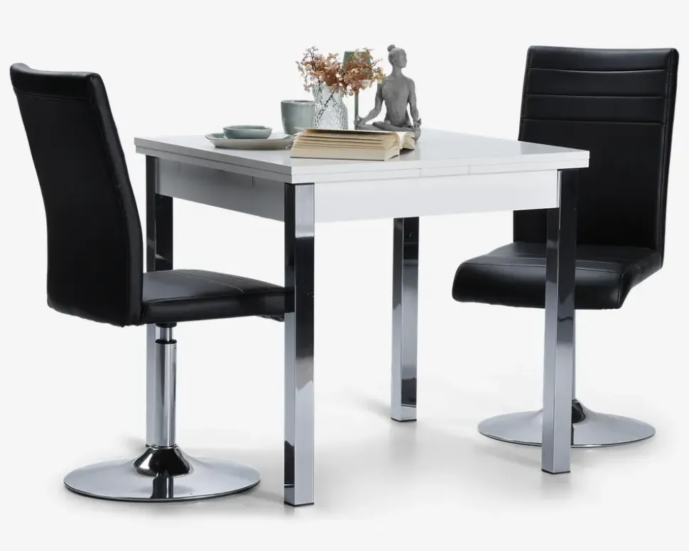 Smart lille spisebord i hvid/krom som passer perfekt ind i den moderne indretning. Spisebordet har hollandsk udtræk, som betyder at du kan trække en tillægsplade ud i begge ender af bordet, og derved få endnu mere spiseplads. Spisebordet måler B.80 x L.80 cm når det ikke er trukket ud, og det er en god størrelse, både hvis du skal bruge bordet i køkkenet, eller i den lille lejlighed. Der er god plads til 2 personer. Spisebordet udvides nemt med en udtræksplade i begge ender, og du får en længde på 147 cm, og det skulle give god plads til 4-6 personer. Bordpladens overflade er i hvid kunstfiner, den er ikke modtagelig overfor fedtede fingre, og du vil opleve et spisebord som er nemt og rengøre og som står flot i hjemmet.Kunstfiner overfladen udmærker sig ved at være særdeles nem at rengøre, overfladen tåler alle former for rengøringsmidler, så længe de ikke indeholder slibemidler. Overfladen kan tåle meget varme, men vi anbefaler at du benytter skåne eller varmebrikker hvis du placerer en gryde på bordet. Overfladen kan ridses, så for at undgå skader kan du med fordel benytte dækservietter, under dit service. Bordet findes også i målet B.80 x L.120 cm, samt i eg kunstfiner eller sort.• Moderne design• Nemt at samle• Mål i cm.: H.76 x B.80 x L.80• Udslået mål i cm.: H.76 x B.80 x L.147• Leveres usamlet