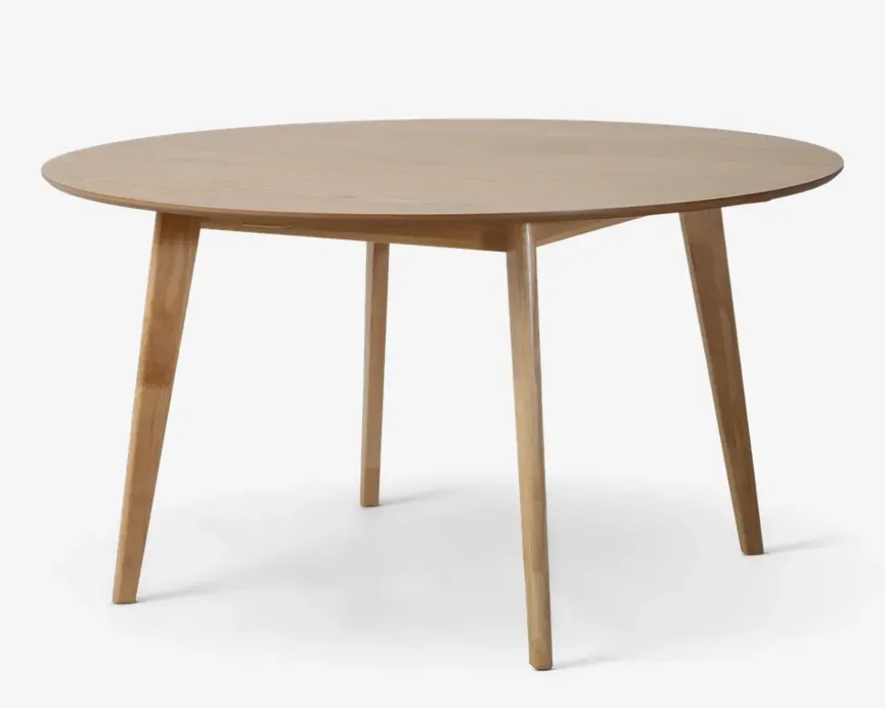 Her har du et elegant lille spisebord med bordplade i lakeret ege finer, og ben i natur gummitræ. Spisebordet er perfekt til det store køkken eller i en mindre lejlighed hvor 6 – 8 spisepladser er nok. Bordet kan ikke udvides. I den finerede bordplade vil du se træets åretegning og du får et bord som har liv og sjæl. Spisebordet kan nemt kombineres med en af spisestuestolene fra vores store udvalg.Spisebordet kræver ingen vedligeholdelse, og aftørres med en klud vredet op i ren vand, for at undgå at du får kalk mærker fra vandet, anbefaler vi at du tørre efter med en tør klud. Der må ikke bruges rengøringsmidler med en slibende effekt, da det vil ridse overfladen. Vi anbefaler desuden at du benytter dig af dækkeservietter når du dækker borde, ligesom varmebrikker er et must, hvis du sætter gryder og pander direkte på bordet.• Flot spisebord i ege finer• Mål i cm.: H. 76 x Ø. 140• Leveres usamlet