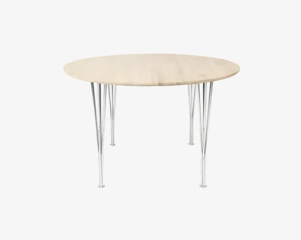 Shape® er en bordserie, som Daells Bolighus har udviklet sammen med en af vores dygtige danske leverandører. Du kan selv sammensætte dit bord som du ønsker, og kan vælge bordplader med udtræk, til spiseborde i forskellige størrelser og træsorter, derudover kan du selv vælge om du ønsker træben eller stålben. Bordserien findes desuden også med bordplader uden udtræk som er velegnet som sofabord, idet du også kan vælge benene i sofabordshøjde.Hele serien er dansk produceret i en meget flot kvalitet, og i høj håndværksmæssig kvalitet. Serien fremstår moderne og tidsløs i designet, og uanset om du vælger bordpladen i massiv træ, eller i laminat kan du til købe ekstra tillægsplader. Alle spisebordsplader leveres som standard med udtræk til 2 ekstra tillægsplader.Dette Shape® spisebord er fremstillet med en bordplade i massiv eg og 6-tråds ben i krom. Bordet måler Ø.120 cm og leveres med et udtræk så du har mulighed for at udvide bordet med 2 tillægsplader, så du kan få et bord der måler B.120 x L.210 cm og giver plads til 10-12 spisende personer. Den massive bordplade giver dig en hård overflade, og står flot i hjemmet. Skulle uheldet være ude kan du slibe overfladen på bordet, og det vil stå som nyt igen. Bordpladen bør efter behandles med enten sæbe eller olie, for at du får en mere modsstandsdygtig overflade, som kan holde bordet fri for skjolder og mærker. Du har selv mulighed for at vælge om du ønsker bordet skal fremstå i den lyse moderne udgave, så skal du benytte hvidolie eller hvidsæbe, eller den mere klassiske udgave så skal du benytte almindelig træolie. Hvis du ønsker at bordet skal fremstå som ubehandlet, skal du efterbehandle med neutrale sæbespåner.• Udtræk til 2 tillægsplader• Ekstra tillægsplader varenr. 86366• Mål i cm: H.73 x Ø.120• Leveres usamlet