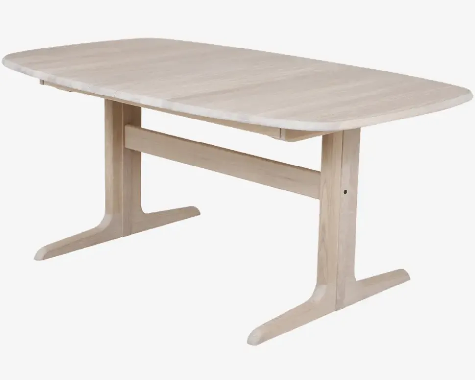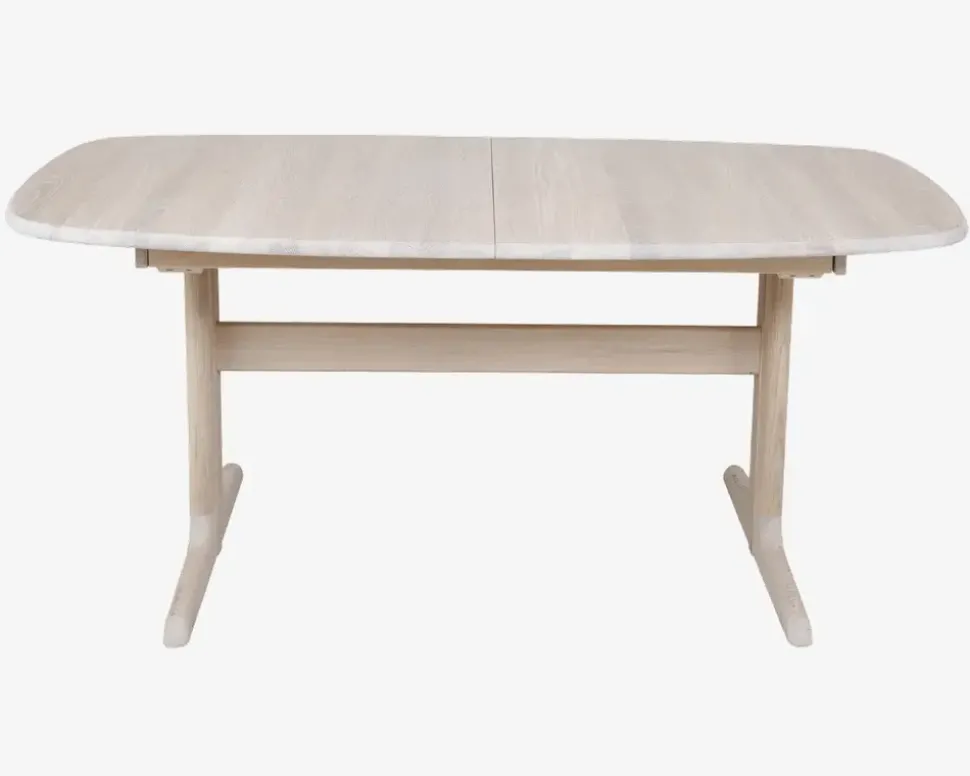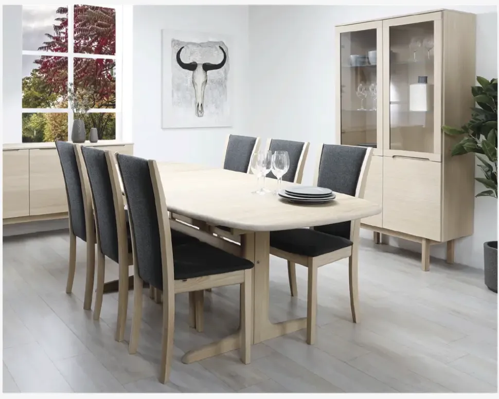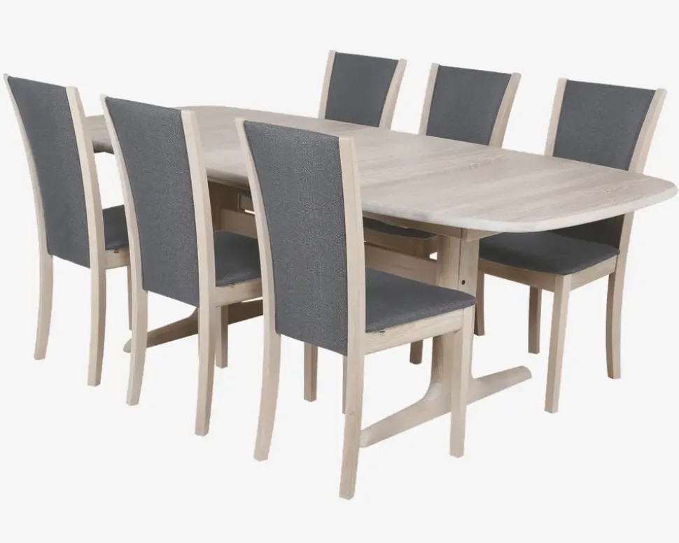 Her tilbyder vi dig et sæt bestående af et spisebord i massiv hvidolieret eg, med 2 tillægsplader i fineret hvidolieret eg, samt 6 spisestuestole i slidstærkt møbelstof. Spisebordet måler B.100 x L.165 cm men kan udvides til en længde på 265 cm, med de to medfølgende tillægsplader, som når de ikke er i brug kan opbevares i et magasin i bordet, så du altid har dem inden for rækkevidde.Bordet er fremstillet i massiv hvidolieret eg, mens de to tillægsplader er i fineret hvidolieret eg, bordet har synkronudtræk, hvilket gør det til en leg at trække bordet ud og ligge tillægspladerne i. Stolene giver med sin halvhøje ryg, og faste polstring en behagelig og støttende siddekomfort, som du vil glæde dig over, når middagen trækker ud i selskab med familie og venner. Møblerne er fremstillet hos den danske møbelproducent Skovby Møbelfabrik. Skovby Møbelfabrik har produceret kvalitetsmøbler til spisestuen siden 1933, og udmærker sig ved at alle deres møbler er fremstillet efter gamle håndværksmæssige værdier. Materialerne der bliver brugt hos leverandøren er special udvalgte, og sammen med en passion og en dygtig medarbejderstab fremstiller de spisestuemøbler som bliver solgt i hele verden. Her får du møbler som du vil have glæde af i mange år frem over.• Polstring i 100% Polyester • Mål på bord i cm.: H.73 x B.100 x L.165 • Udslået mål i cm.: B.100 x L.265 • Mål på stol i cm: H.95 x B.47 x D.56 • Sædehøjde: 46 cm• Bord leveres usamlet, stole leveres samlet