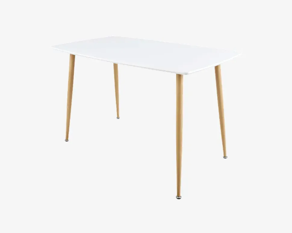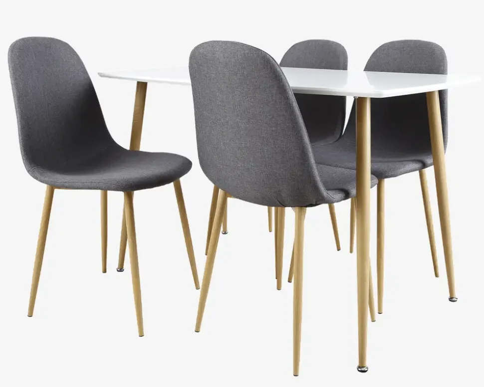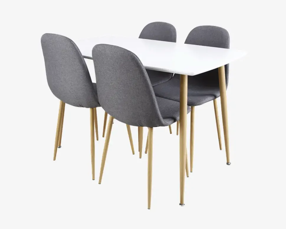 Spisebordssæt til 4 personer, fremstillet i et let og moderne design. Sættet består af et spisebord i B.70 x L.120 cm og 4 spisestuestole. Spisebordet er fremstillet med en bordplade i hvidlakeret MDF og 4 metalben i egetræsfarvet. Spisestuestolene er fremstillet med et betræk i gråt møbelstof og metalben i egetræsfarvet. Konstruktionen er stabil, og du får en god siddekomfort i spisestuestolen. Sættet er perfekt til køkkenet eller den lille lejlighed, der er god plads til 4, bordet har ikke mulighed for udvidelse, så hvis du skal bruge mere plads, bør du kontakte os, så vi kan vejlede dig til en af vores andre spiseborde.Sættet leveres usamlet, så du skal selv monterer ben på både stole og spiseborde, det gøres og nemt, hvis du følger den vedlagte samlevejledning. Sættet kræver ingen vedligeholdelse, og rengøringen af både bord og stole foretages med en klud vredet op i rent vand. Husk at eftertørre bordpladen med en tør klud, så du undgår mærker efter kalken i vandet. Der må ikke benyttes rengøringsmidler med en slibende effekt, da dette vil ødelægge bordpladen. Vær opmærksom på at den lakeret bordplade kan ridses, og vi anbefaler derfor at du benytter en dug eller dækkeservietter når du dækker op, ligeledes anbefaler vi at du på frugtskåle eller lignende benytter dig af filtdupper, på den måde kan du holde sættet flot i mange år.• Ekstra spisestuestole kan tilkøbes varenummer 19546, sælges i pakker af 4 stk. (4 stk.)• Mål i cm. på spisebord: H.75 x B.70 x L.120• Mål i cm. på spisestuestole: H.87 x B.44 x D.53• Sædehøjde: 49 cm• Leveres usamlet