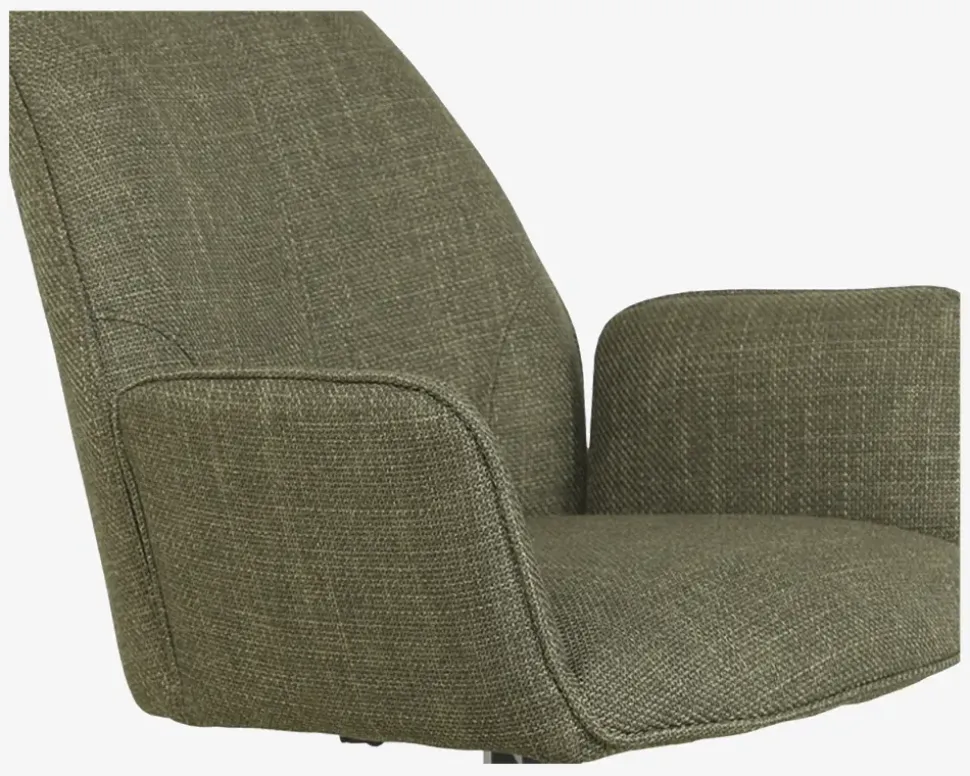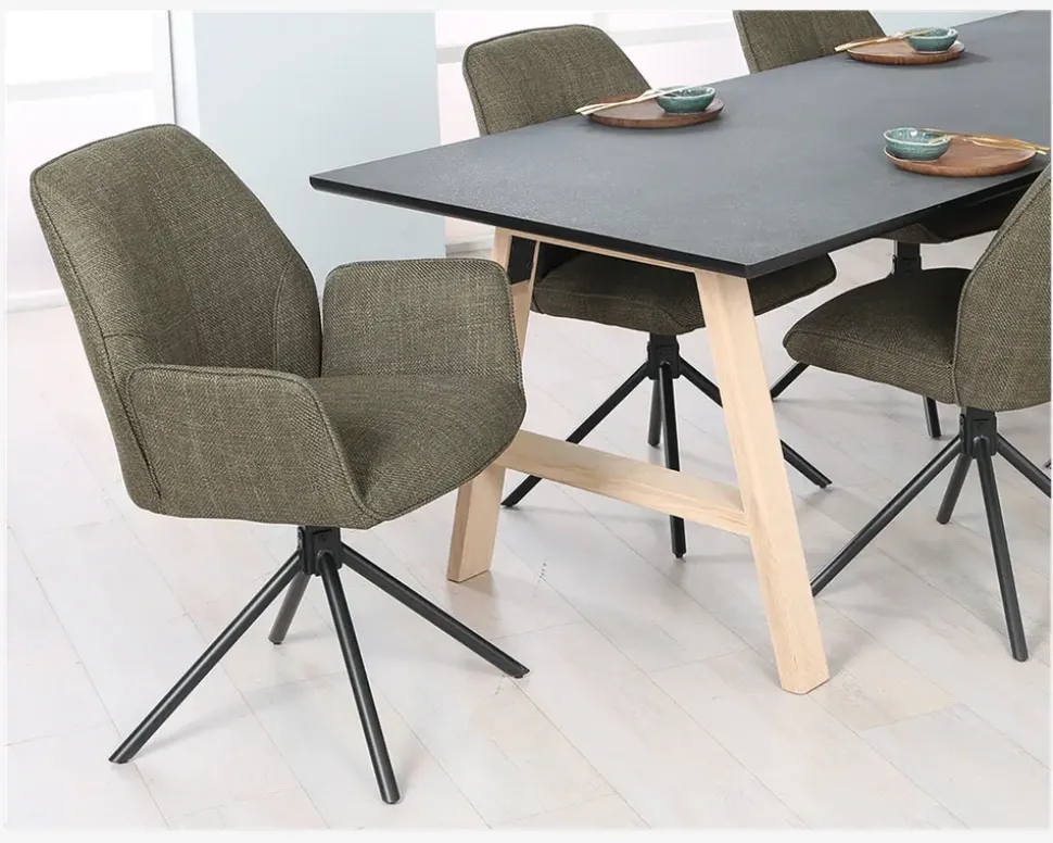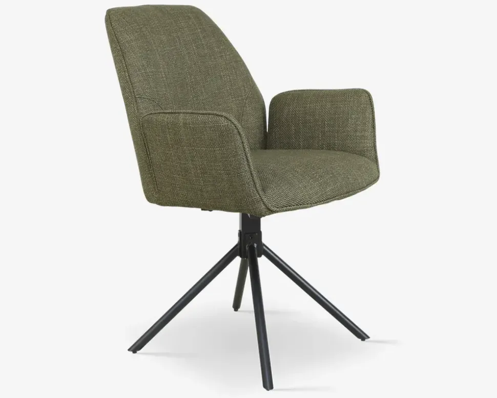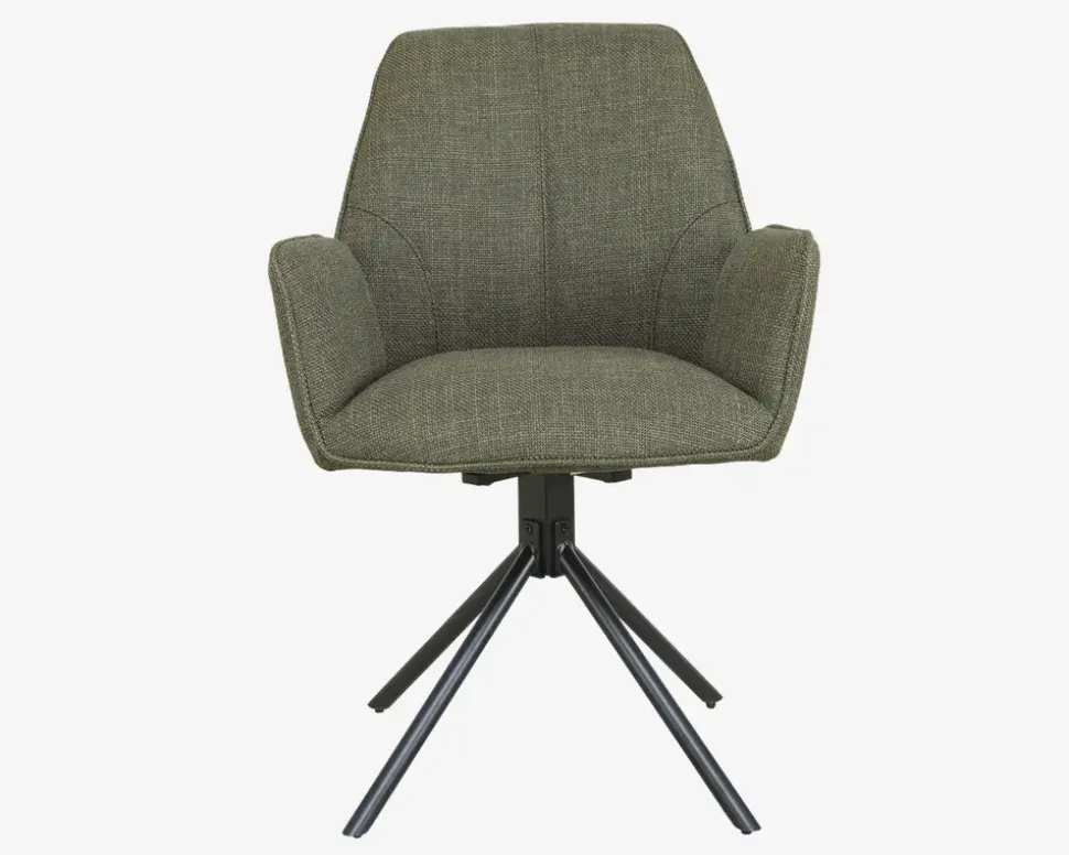 Her har du en flot spisestuestol med armlæn og en fremragende siddekomfort. Stolene er fremstillet i kraftig grønt møbelstof, mens basen er i sort stål. Basen er en dreje base, som gøre stolen utrolig let at sætte sig i, og rejse sig fra selv om I sidder mange ved bordet. Basen har en “swing back” funktion, som betyder at stolen drejer tilbage til udgangspunktet når man slipper den, dette skal man naturligvis være opmærksom på, så man kan undgå eventuelle faldskader, fordi sædet ikke er der hvor man regner med.Stolen kræver ingen vedligeholdelse, og rengøres med en klud vredet om i rent vand. Du bør være opmærksom når du støvsuger, så du undgår at ridse stellet. Spisestuestolen findes også uden armlæn, så du har mulighed for at kombinerer rundt om bordet.