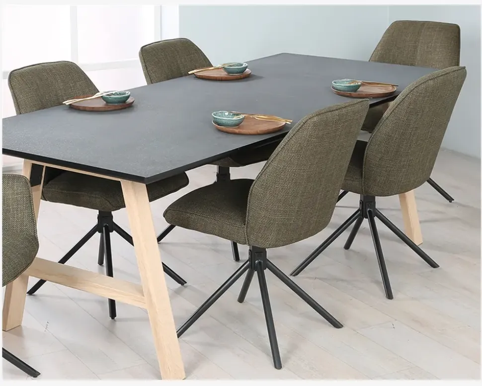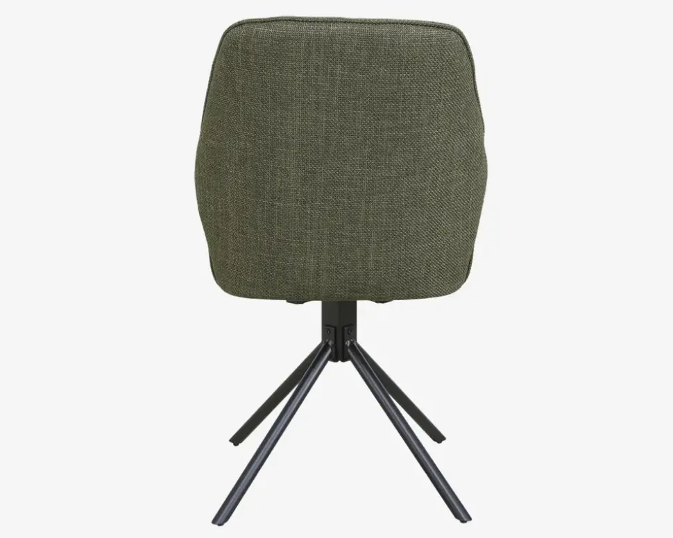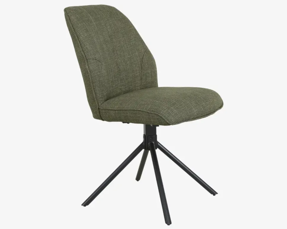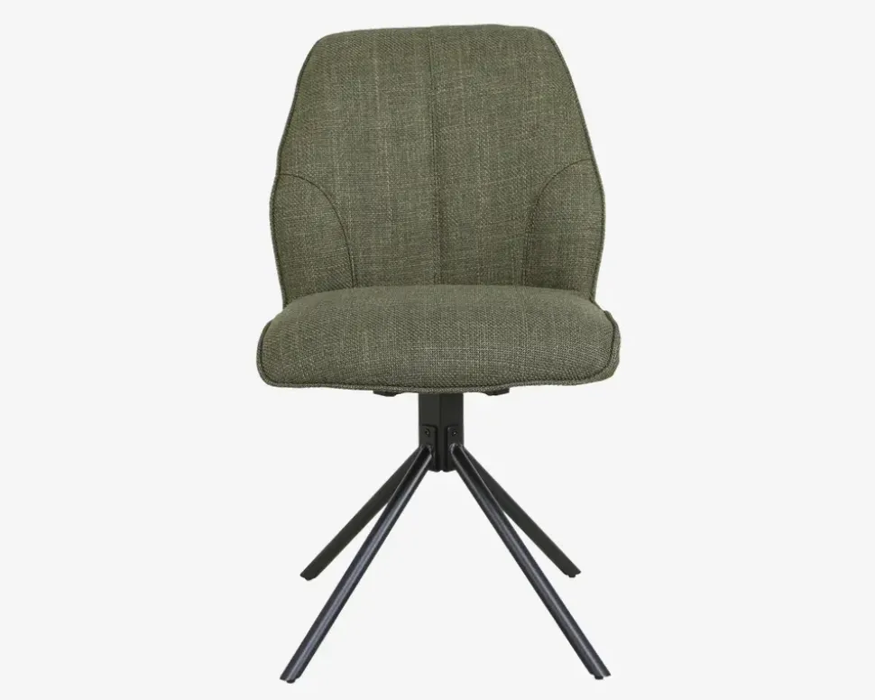 Her har du en flot spisebordsstol med fremragende siddekomfort. Stolene er fremstillet i kraftig grønt møbelstof, mens basen er i sort stål. Basen er en dreje base, som gøre stolen utrolig let at sætte sig i, og rejse sig fra selv om I sidder mange ved bordet. Basen har en “swing back” funktion, som betyder at stolen drejer tilbage til udgangspunktet når man slipper den, dette skal man naturligvis være opmærksom på, så man kan undgå eventuelle fald skader, fordi sædet ikke er der hvor man regner med.Spisestolen kræver ingen vedligeholdelse, og rengøres med en klud vredet om i rent vand. Du bør være opmærksom når du støvsuger, så du undgår at ridse stellet. Spisestuestolen findes også med armlæn, så du har mulighed for at kombinerer rundt om bordet.