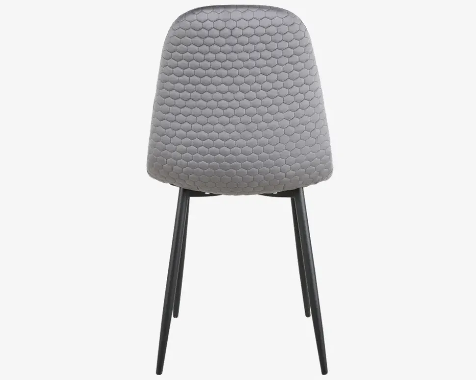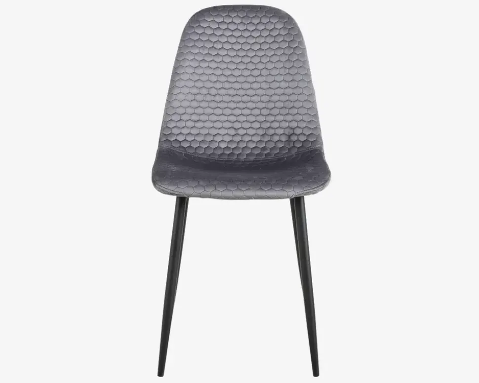 En lækker spisebordsstol med en god siddekomfort, som kan kombineres med en lang række forskellige spiseborde. Stoffet er grå velour, og syninger i ryggen giver stolen et flot udseende, benene er i sort pulverlakeret stål. Den gode sædeform og polstring giver stolen en behagelig og støttende siddekomfort som du vil glæde dig over. Stolen sælges i pakker af 4 stk.Stolen kræver ingen vedligeholdelse, og den rengøres med en klud vredet op i rent vand, husk at tørre efter med en tør klud. Benene er i pulverlakeret stål eller 3-D laminering, det betyder at de kan ridses og skrammes, så vær forsigtig når du støvsuger, så vil stolene holde sig flot i mange år. Stolene levers usamlet, men de 4 ben monteres let.