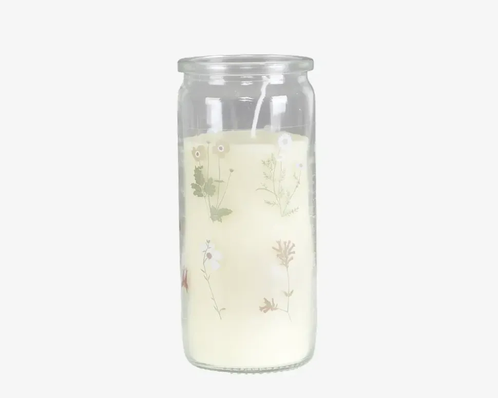 Et flot og dekorativt stearinlys, som både kan bruges inde og ude. Glasset skærmer fint for vinden, og du vil kunne nyde flammen, når du sidder på terrassen eller i haven. Lyset bør ikke stå ude i regnen, da du vil opleve at det bliver svært at tænde. Lysene findes med mange forskellig dekorationer på glasset, fælles for dem alle at de underbygger sommerstemningen. • Stearin• Flot dekoration• Brændetid ca. 45 timer• Mål i cm.: H.14 x Ø.6