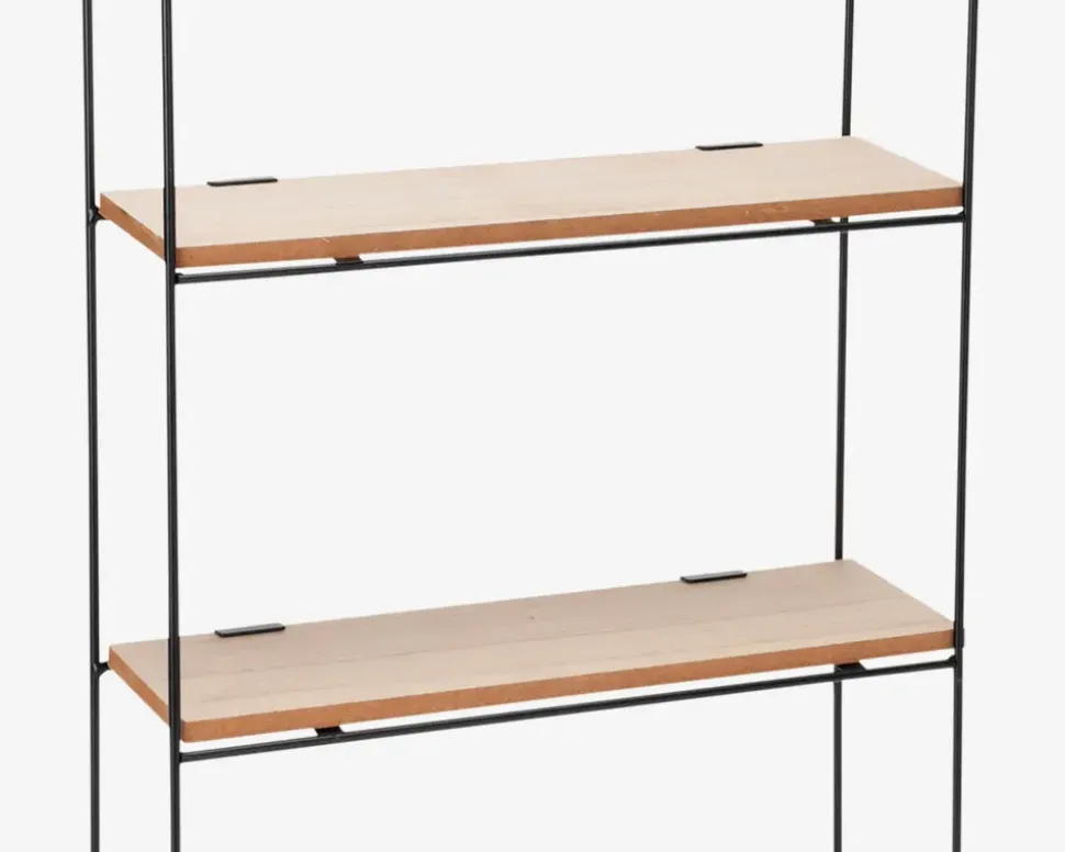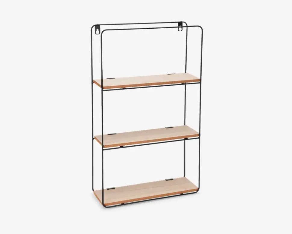 Dekorativ vægreol i sort jern og MDF med målene 30x10x50 cm. Reolen har et enkelt og moderne design, der passer ind i de fleste rum som f.eks. i entréen, stuen eller på badeværelset. Brug den til små pyntegenstande, planter eller opbevaring.