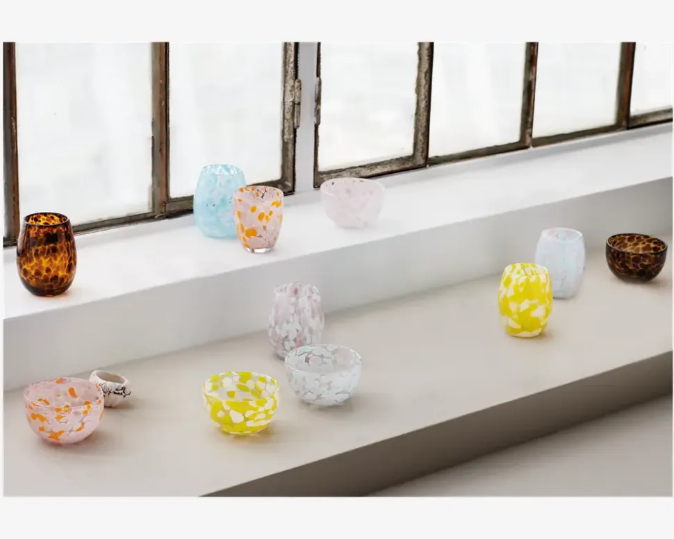 Vandglas i mundblæst glas med mønster i pink / orange nuancer. Glasset er en del af en serie som fremstilles i forskellige farver, ligesom der findes skål i serien. Glasset tåler opvaskemaskine.• Mål i cm. : H.10 x Ø.8• Materiale: glas• Farve: pink/orange