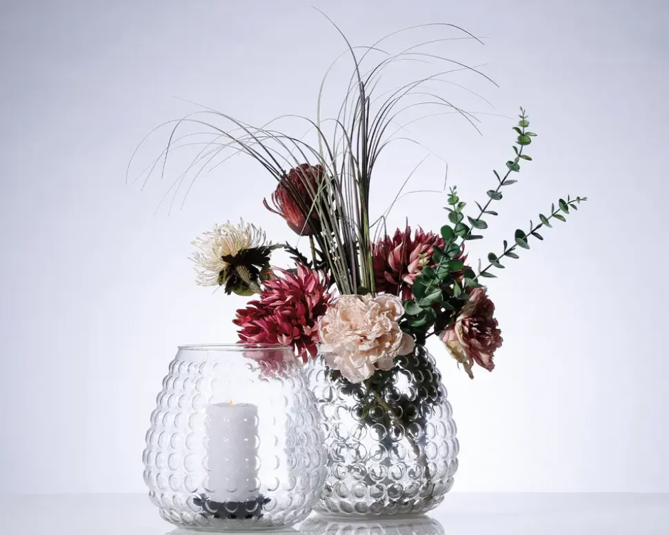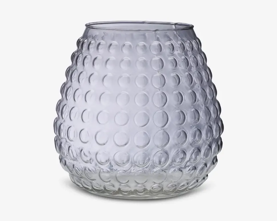 Vase i klart glas med bobler i størrelsen 20×25 cm. Den dekorative struktur giver et unikt udtryk, der passer smukt ind i hjemmets indretning. Vasen kan bruges til både friske og tørrede blomster, men fungerer også perfekt som lanterne indendørs, hvor lyset skaber en hyggelig stemning. En alsidig og stilfuld detalje til boligen.